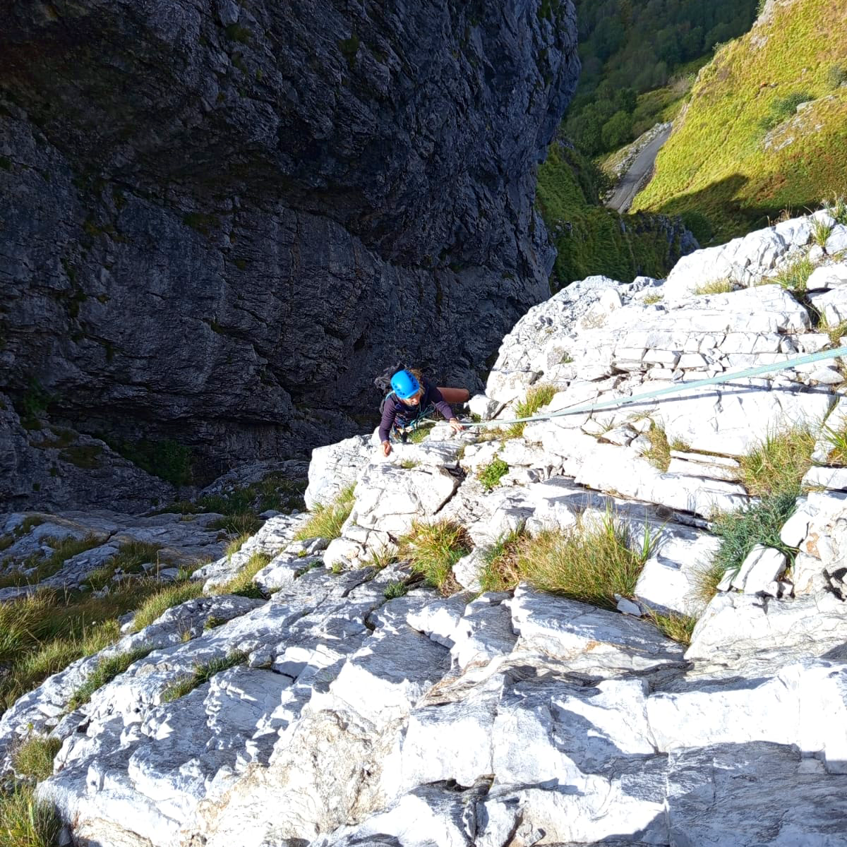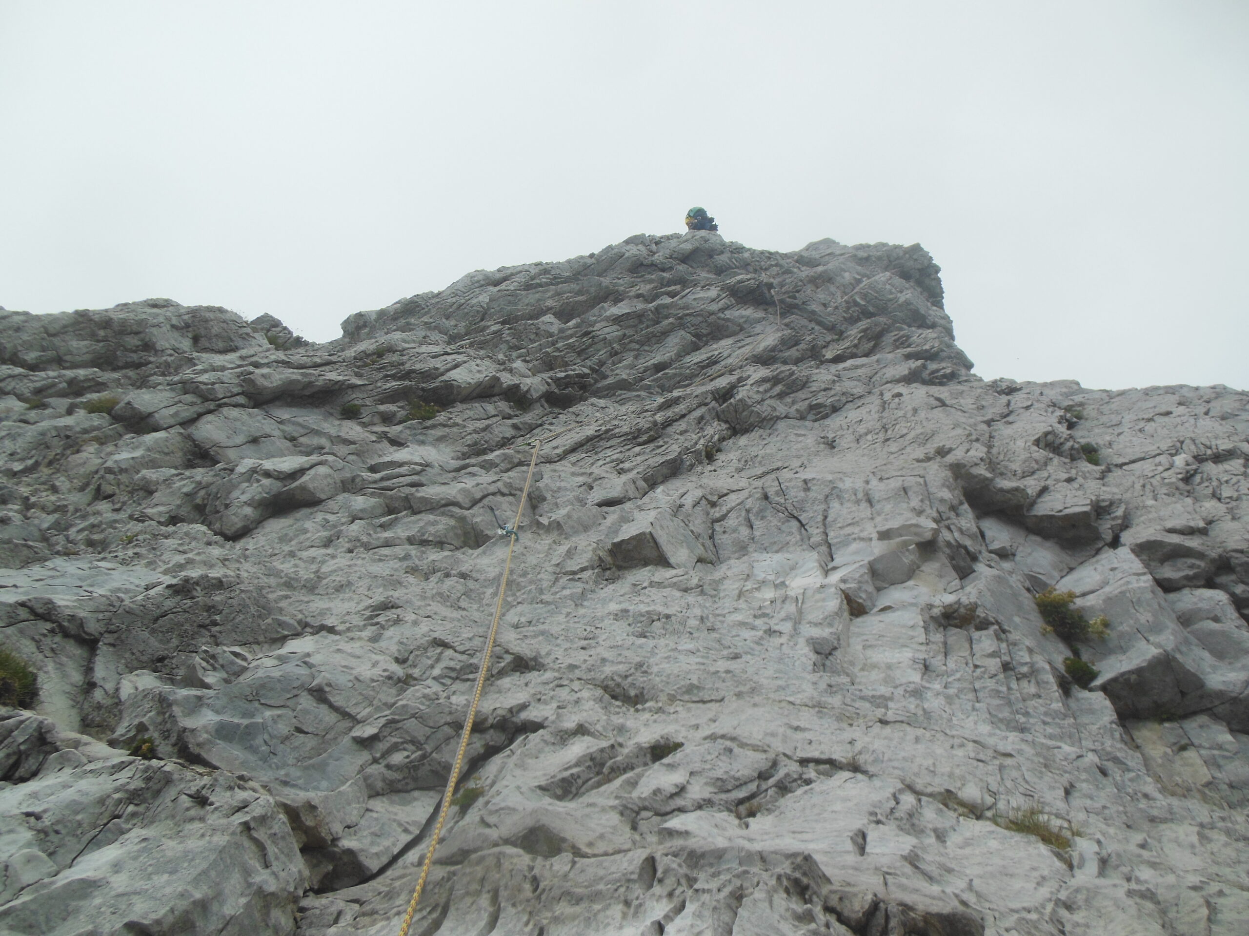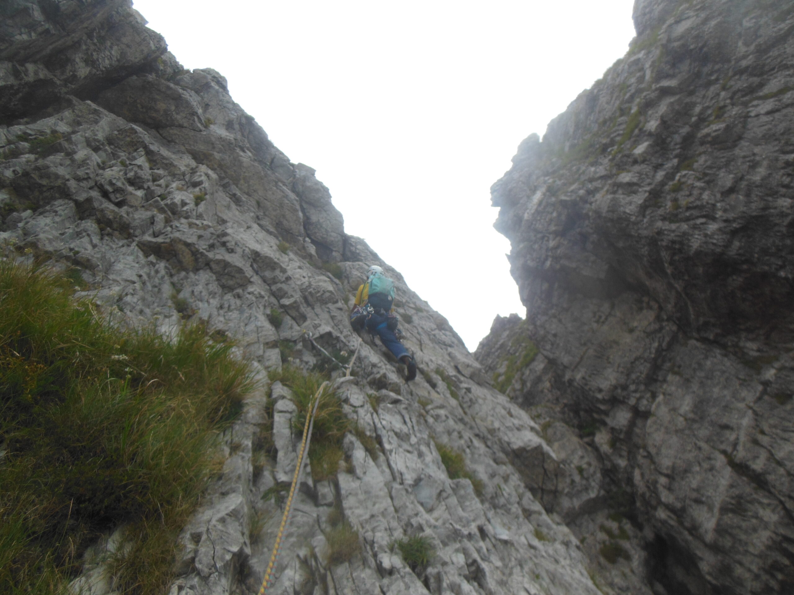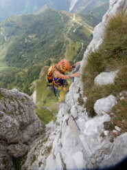 - 2° tiro. Si supera la cengia su placca appoggiata (spit nascosto a dx) e dopo un breve strapiombo si ci ribalta sullo spigolo e di lì alla sosta con catena ma un po’ malridotta. ( 5c spesso 5b).