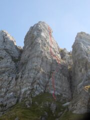 - 1° tiro. Si attacca prima su placca a gradoni con paleo poi si fa più verticale con passaggio ( 6a) in un diedrino superato il quale si raggiunge una cengia con sosta con catena (6a spesso 5°).