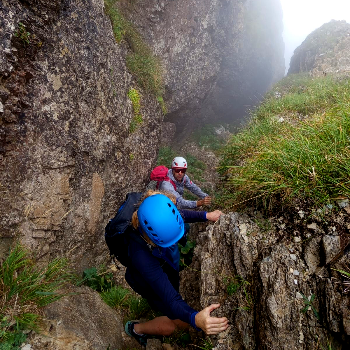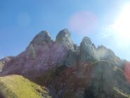 - 5° si riunisce al percorso della via classica che per facili risalti e roccette III. porta ad una sosta a spit da attrezzare.