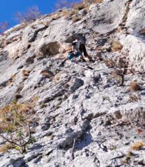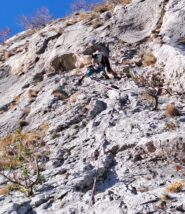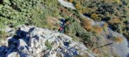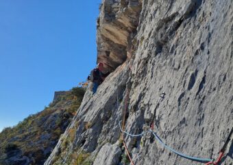Via discontinua che alterna tratti verticali di bella arrampicata a tratti di raccordo più semplici.