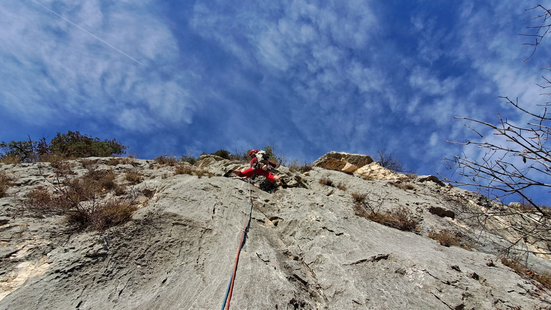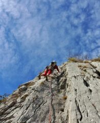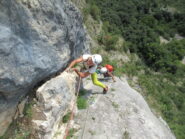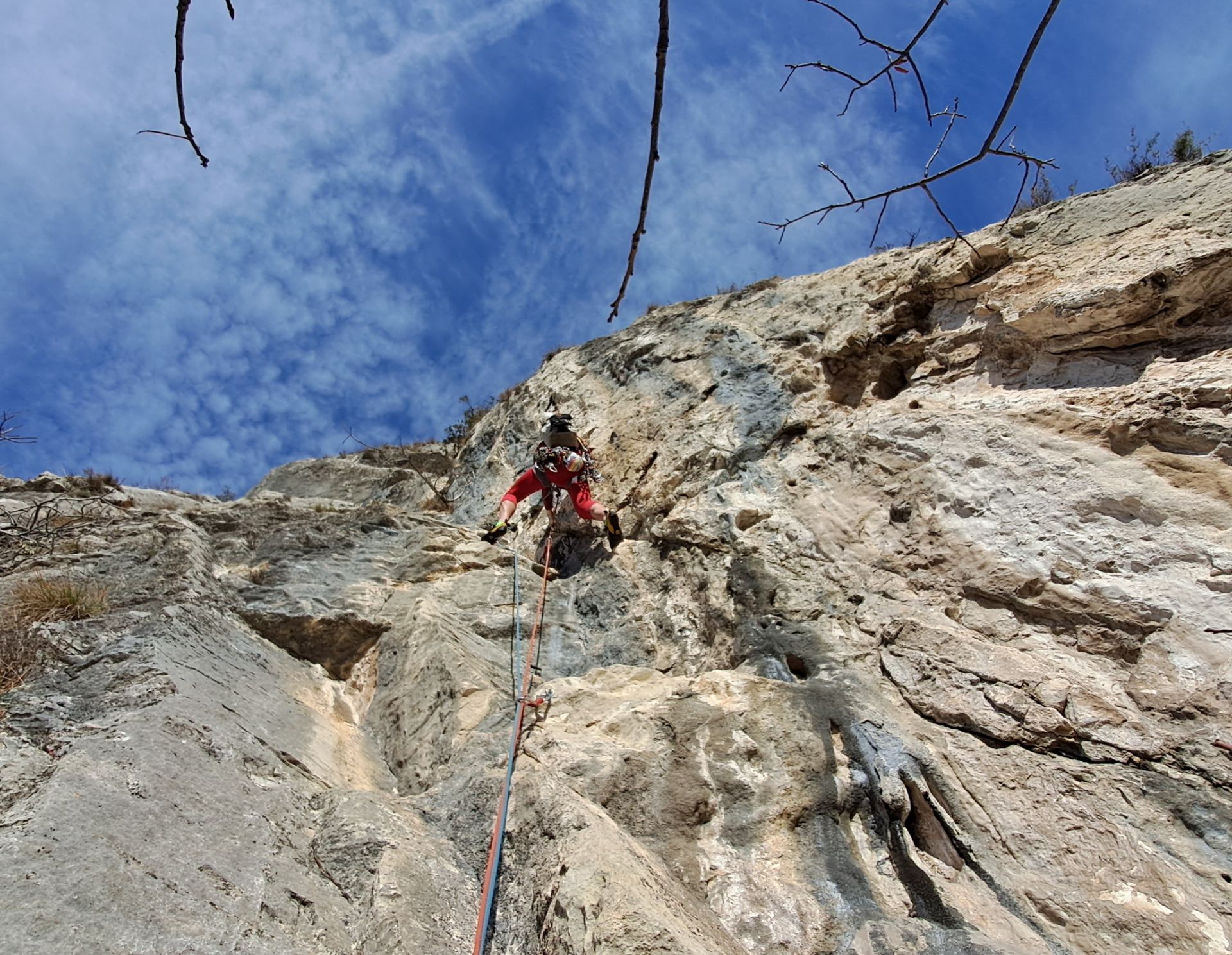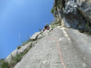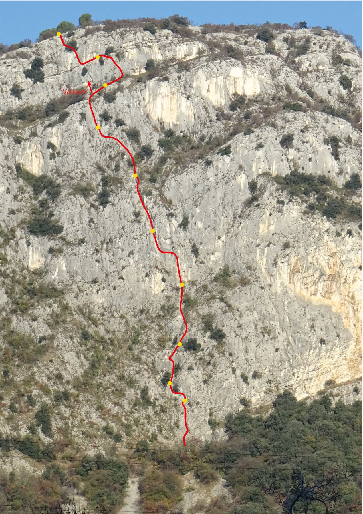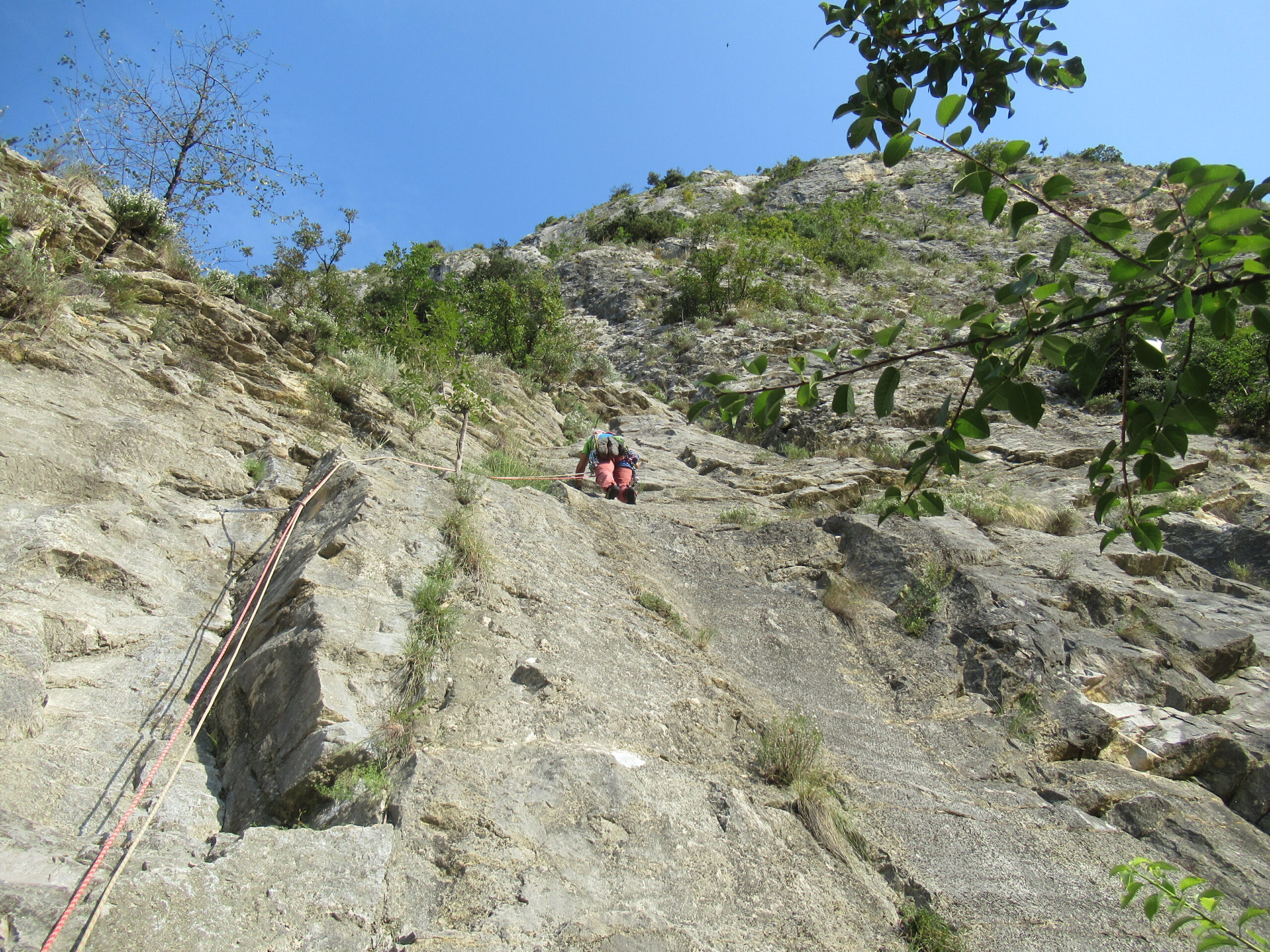 - L7: proseguire dritto sul pilastro che si ha di fronte per poi obliquare a sinistra su roccia molto lavorata puntando alla base di un evidente diedro. 4b, 4a (35m) 4 spit, 2 clessidre.