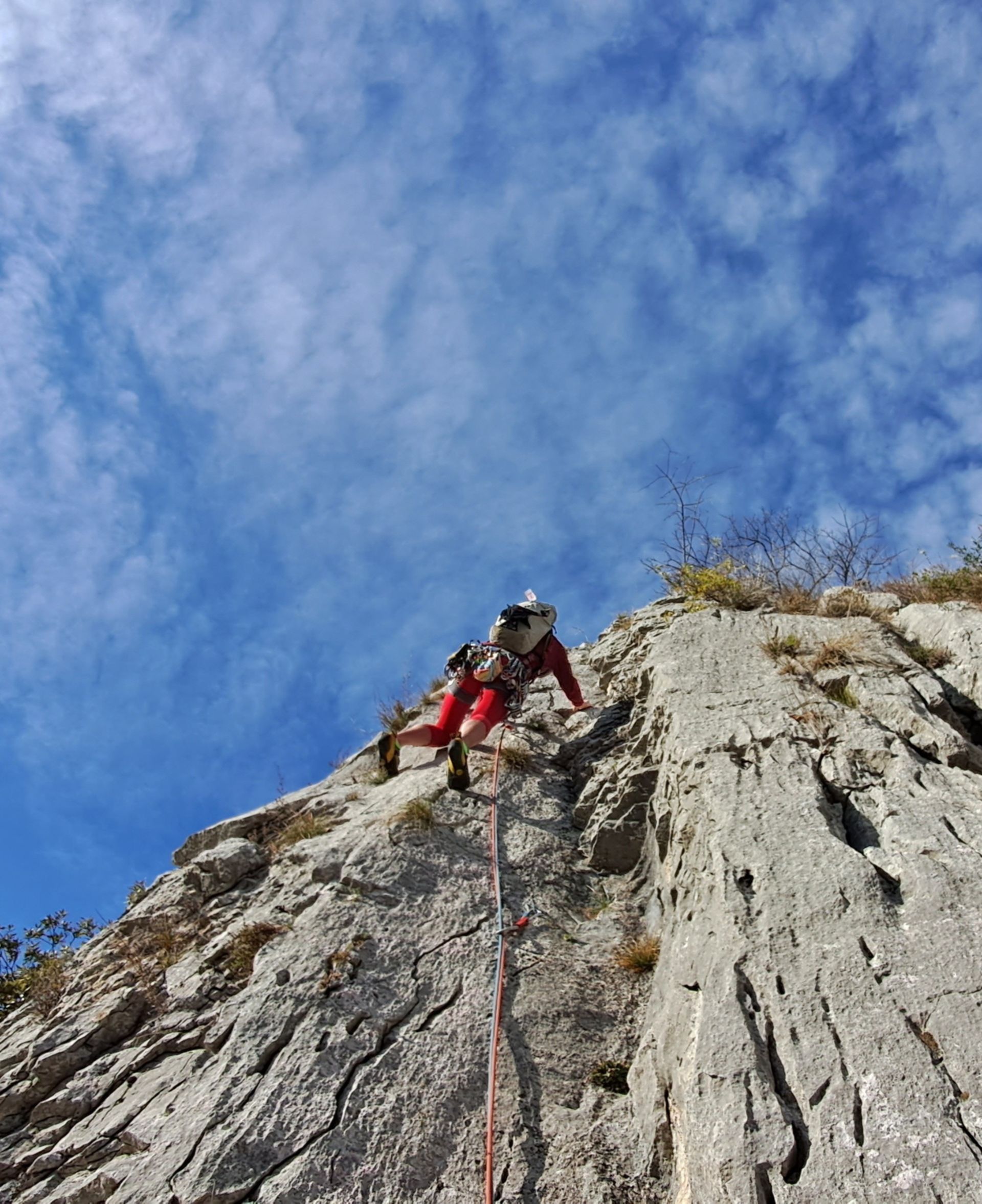 - L5: tiro molto estetico che affronta un bel diedro ammanigliato e addomesticabile, nonostante si senta le verticalità. Qui troviamo il secondo passaggio chiave della via, qualche spit prima della sosta. 6a, 6b (30m) 10 spit.