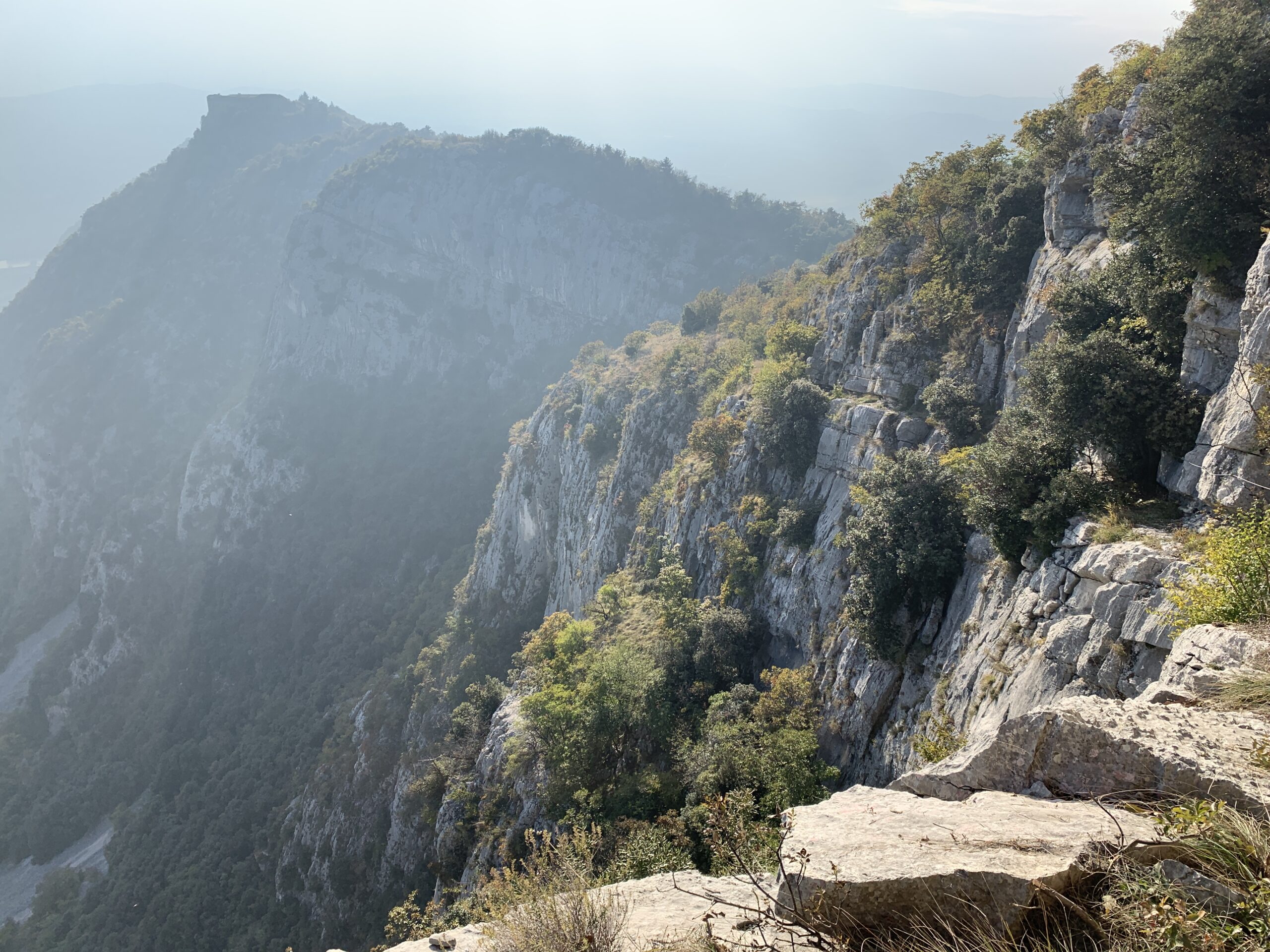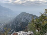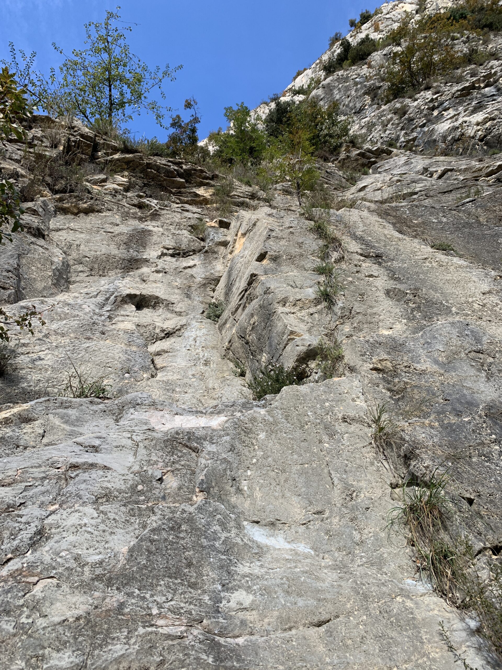 - L10: proseguire a sinistra seguendo la ferrata fino all’attacco di un’evidente fessura, salirla con logica fino ai lecci e poi per facili roccette fino al fine via. 5a, 3(30m) 2 spit, 1 clessidra.