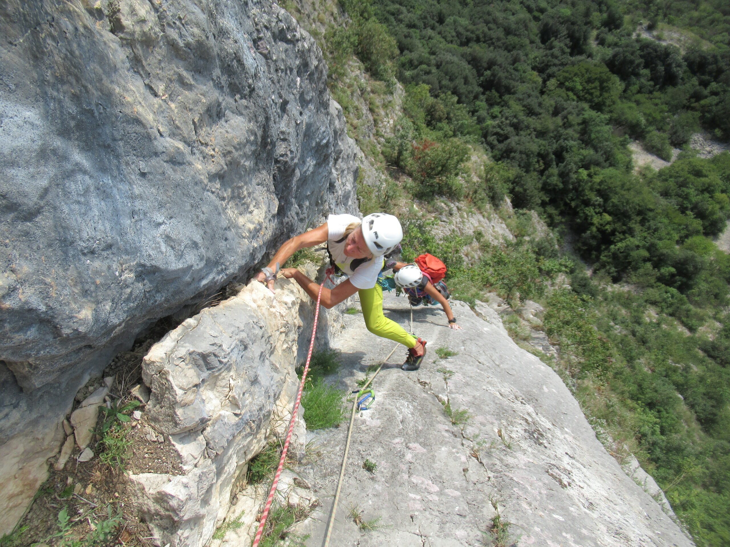 - L9: traversare a destra per 7-8 m, ed attaccare la bellissima placca che poi offre una lama molto netta che agevola il passaggio. Sostare sulla ferrata + golfaro. 6b, 5c+ (25m) 5 spit.