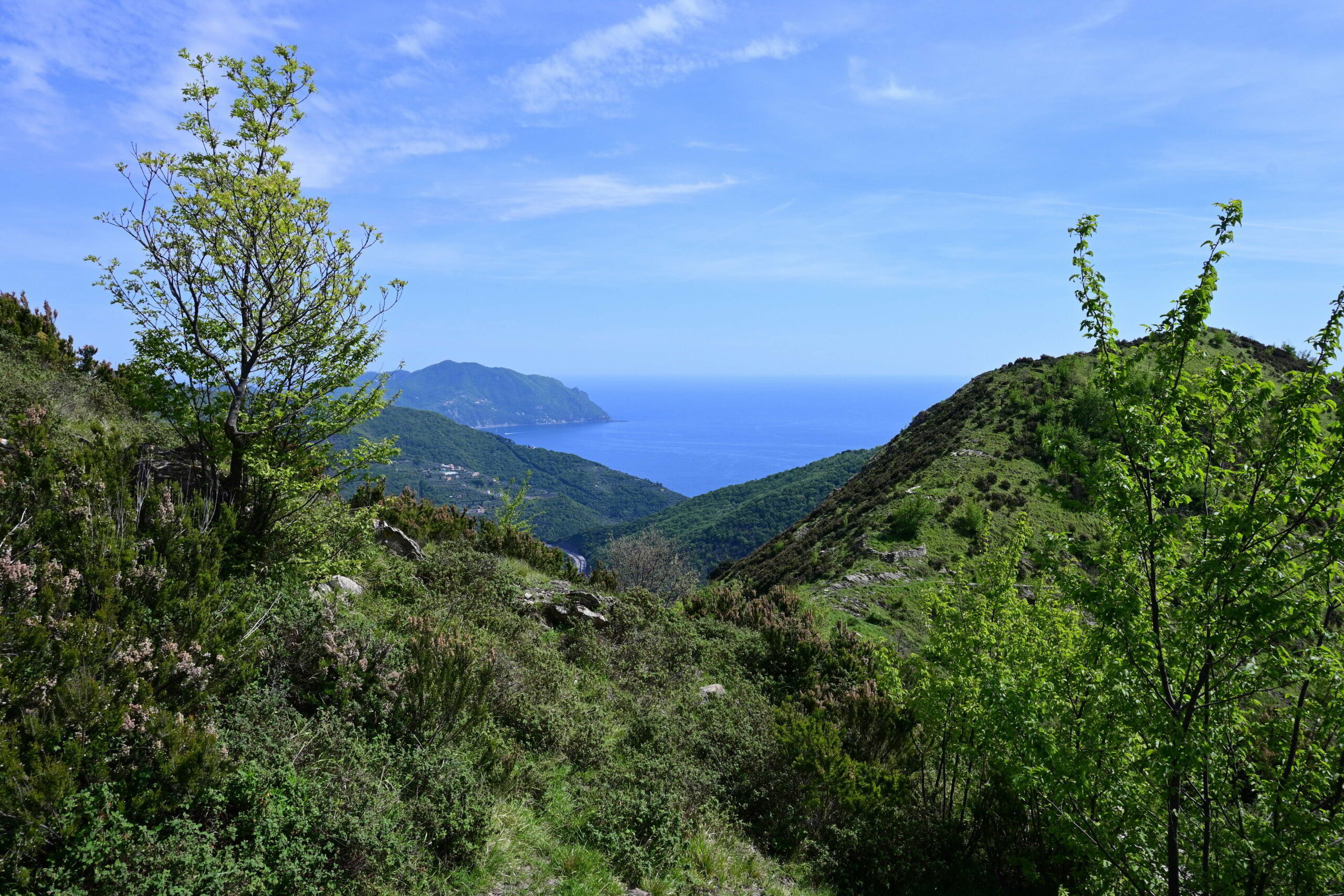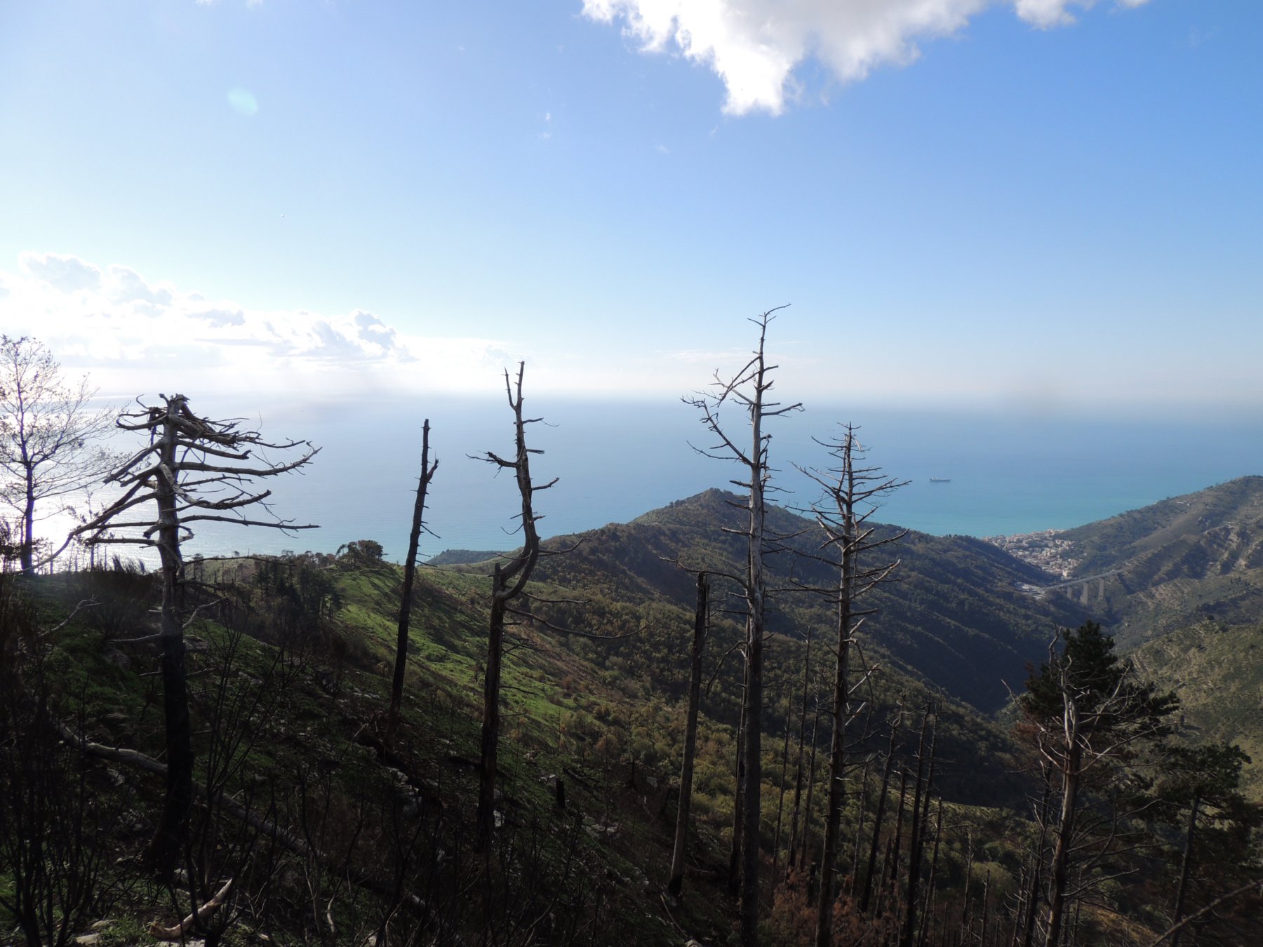 Salendo oltre l’abitato, il sentiero si fa ripido e sassoso, si giunge ad una cisterna di acquedotto e poco oltre all’unica sorgente di tutto il percorso ,si fiancheggia una vecchia zona terazzata tipica dei monti liguri quindi giunti sulla sommità che sovrasta Sessarego il sentiero che non è segnalato ma ben visibile si fa meno ripido e volgendo verso ovest incrocia il sentiero che proviene da Genova Nervi contrassegnato da due triangoli rossi , qui saliamo a destra tra pini distrutti da recenti incendi sino quasi alla strada asfaltata, sulla sx si sale per la vicina vetta del m. Cordona (802 m.). Grande panorama sul vicino Monte Fasce e le sue antenne.