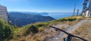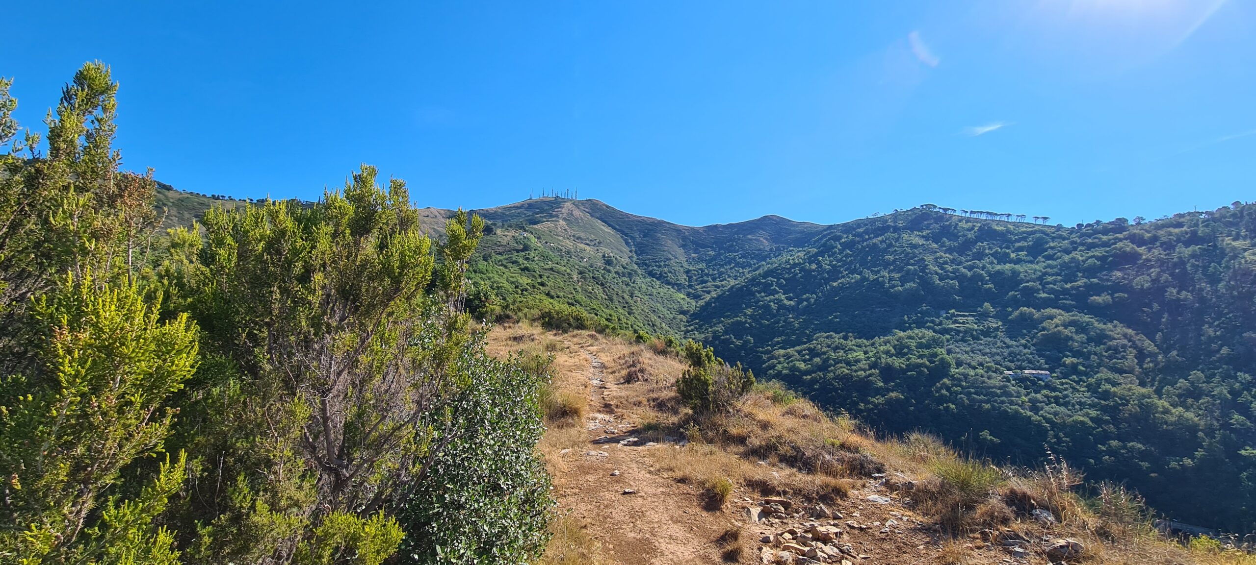 Si parte scendendo una mulattiera ripida a gradoni, alcuni piuttosto alti, poi traverso facile (paesaggio devastato dal recente incendio) che porta ad una sella panoramica. Quì la mulattiera riprende a scendere a gradoni piuttosto irregolari. Io consiglio di prendere invece leggermente a sx, percorrendo una divertente crestina su erba e roccette che scende poi con percorso libero verso un traliccio, lo si supera per poi immediatamente risalire brevemente su sentiero fino alla sommità dell’ampia cresta. Da qui si scende decisamente verso sud incontrando nuovamente la mulattiera che percorre l’ampio spartiacque che scende fino al mare separando il vallone di Nervi da quello di Bogliasco.
