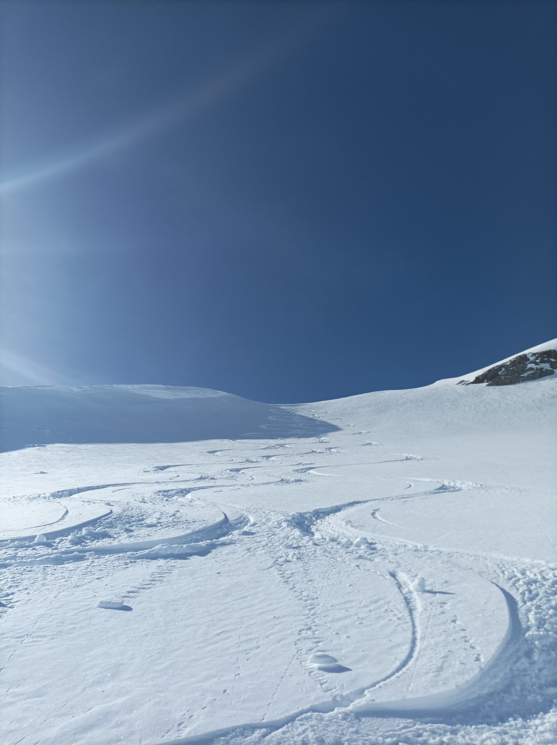 In discesa fino all’imbocco del canale abbiamo sciato su ottima neve farinosa. Il canale nella prima parte anche, in centro abbiamo beccato delle placche ventate dure, poi di nuovo farina a tratti più lavorata ma ben sciabile. Dopo il canale man mano che si scendeva la neve crostava, ci ha salvato buttarci sulla traccia di discesa dal col Serena che era battuta pure in discesa.