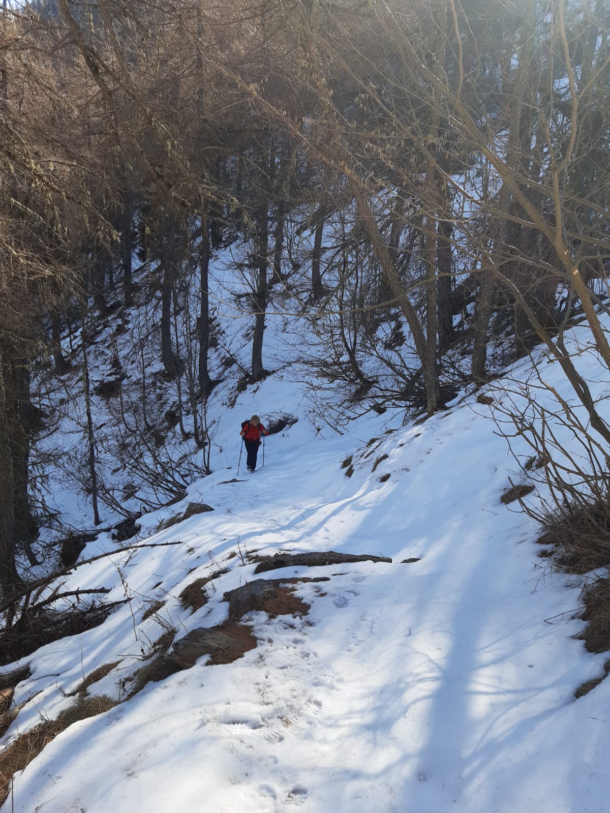 Ora il sentiero sale più marcato e a quota 984 m incrocia la mulattiera che proviene da sx da Albard di Bard. Qui è possibile procede a dx sull’ampia mulattiera oppure proseguire attraversandola e salendo da un scorciatoia (sentiero ben evidente) che ci riporterà a riprendere la mulattiera a quota 1135 m.