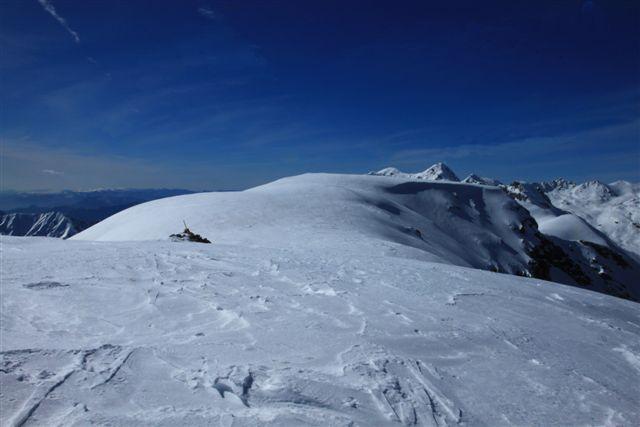 Seguire il crestone verso sinistra tra radi larici fino alla piatta Pointe de Viole m. 2316, dalla quale, dirigendosi verso ovest lungo il largo e panoramico spartiacque Miniere-Ceva si raggiunge la quota 2378 m., per salire deviando a sinistra alla Cima Est (Cima del Becco m. 2439). Proseguire per circa 700 metri sull’ampio e piatto crinale fino alla Cima Ovest m. 2455 il punto più alto.