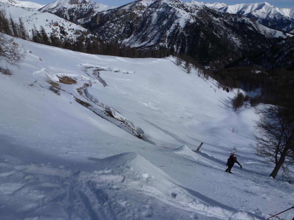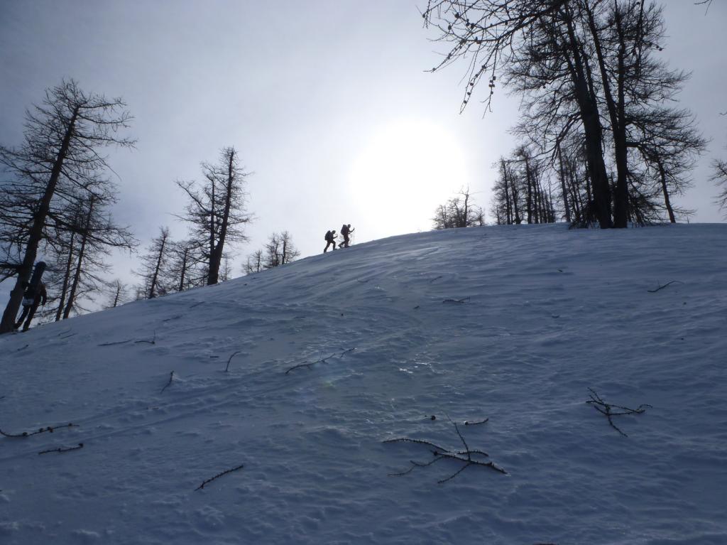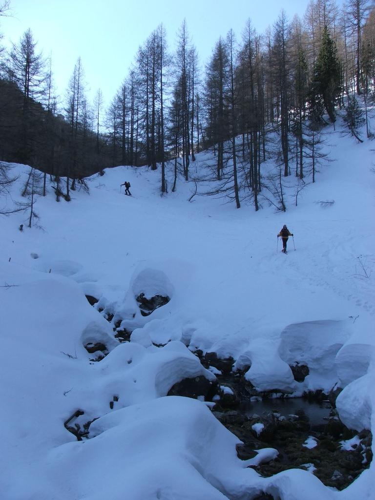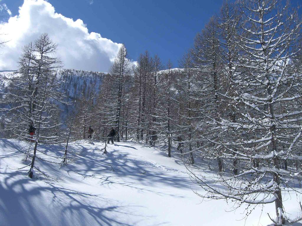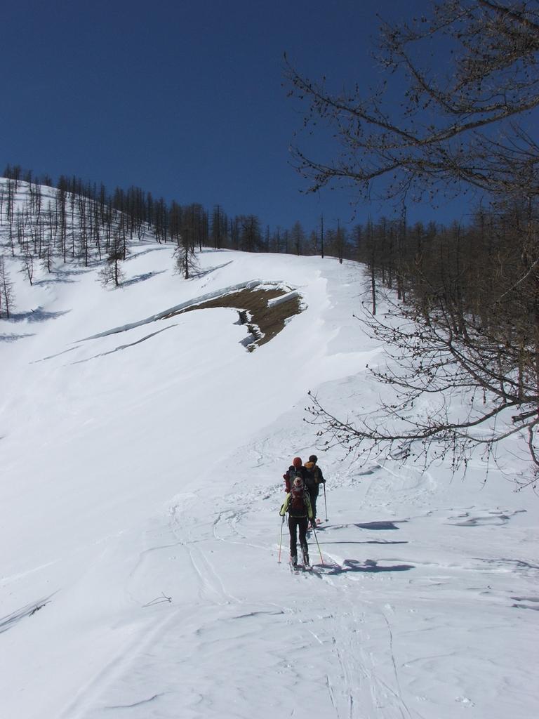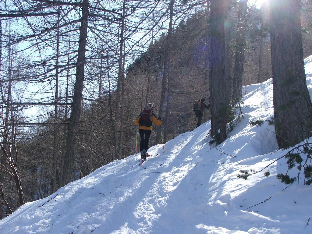 Risalire il boscoso e ripido pendio fino a quota circa 1750 nei pressi di una radura. voltare a dx, salire per valloncelli fin quando non si intravede sulla sx un canalone che scende dai pressi della pointe de viole.