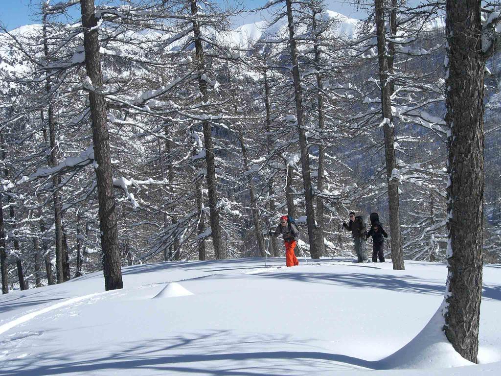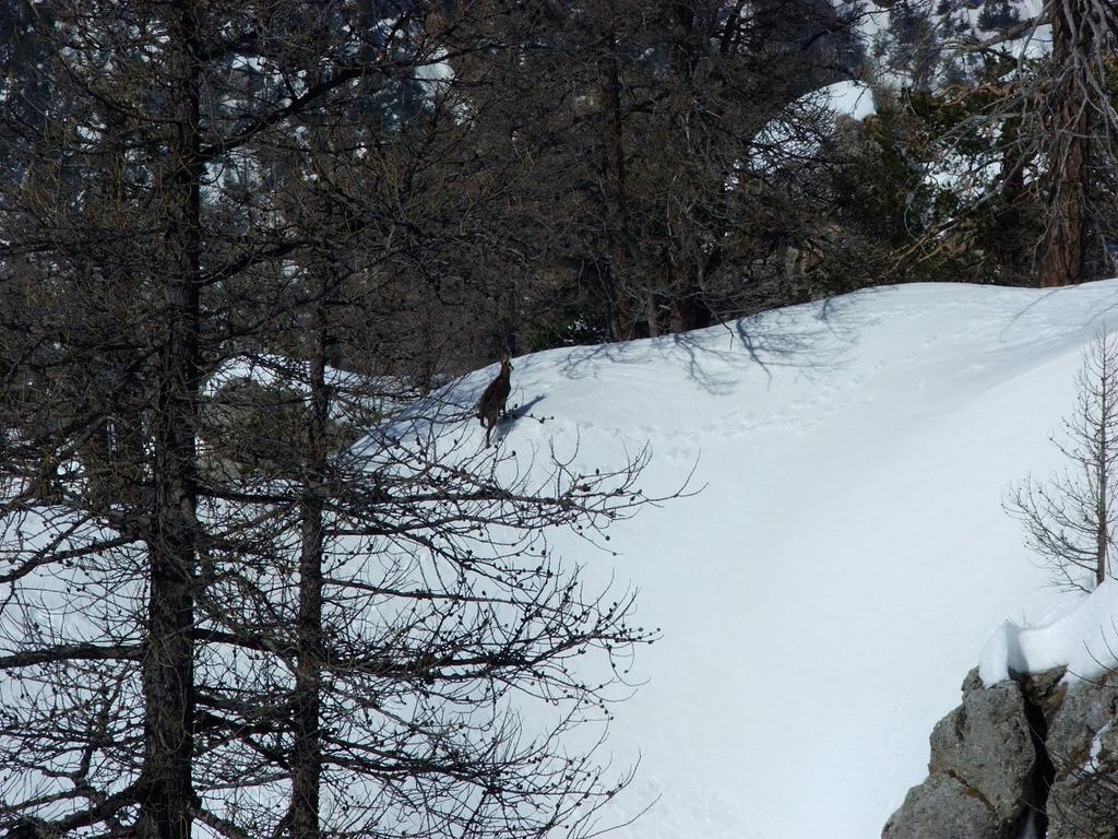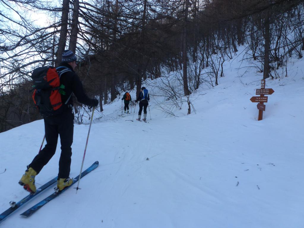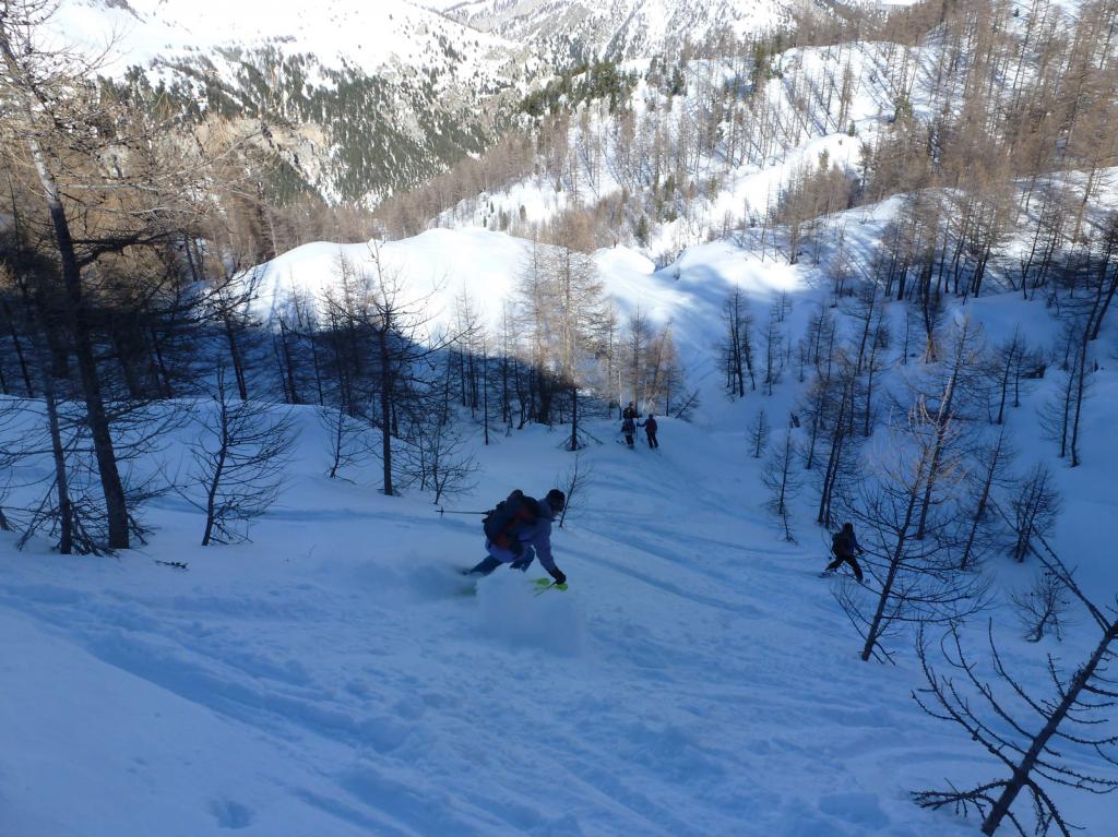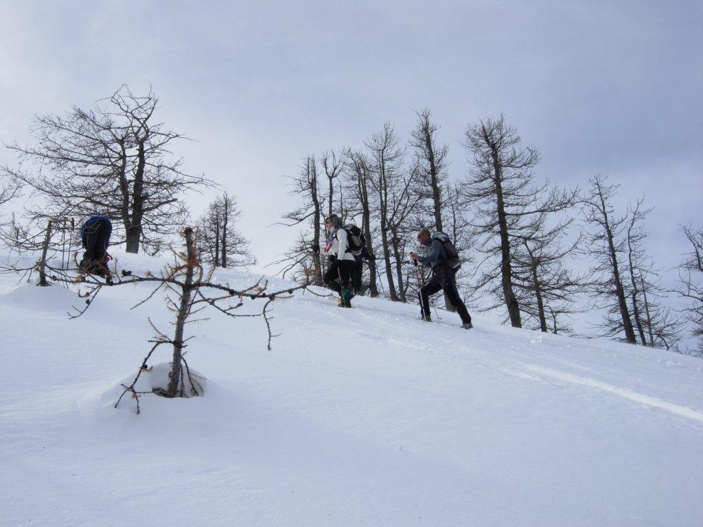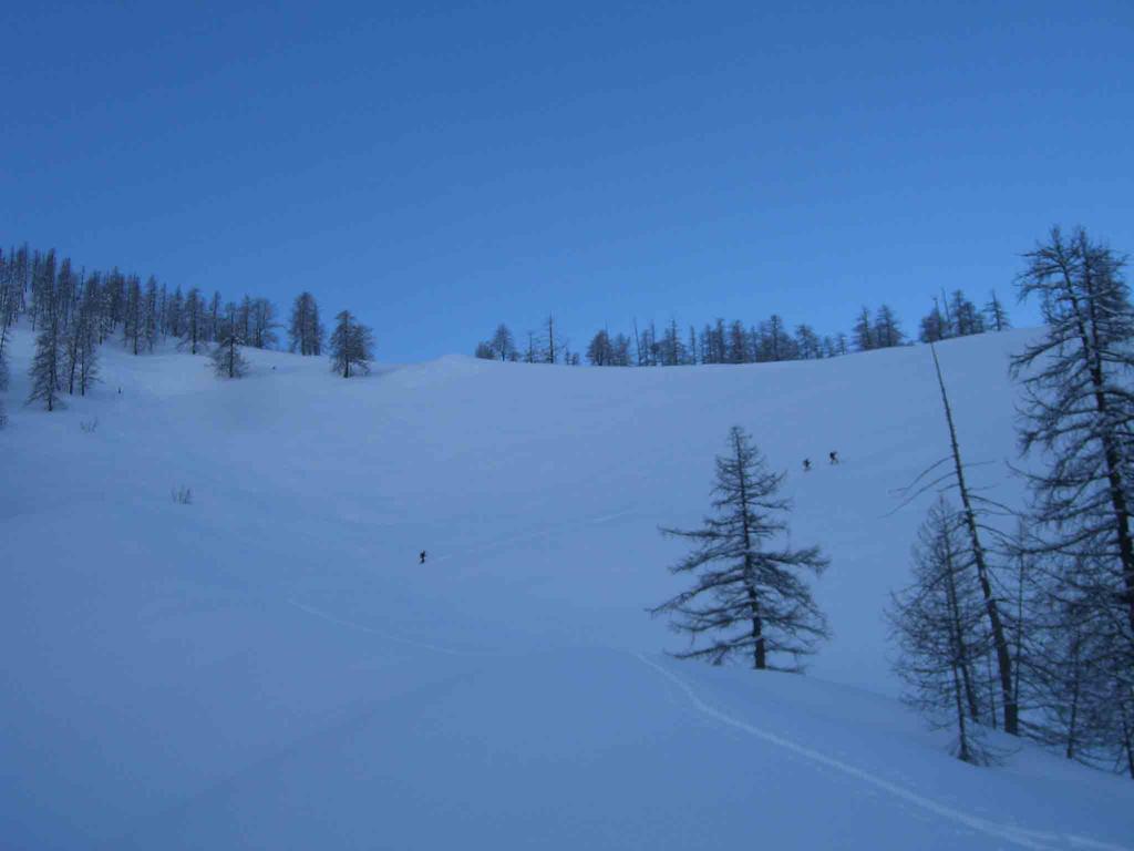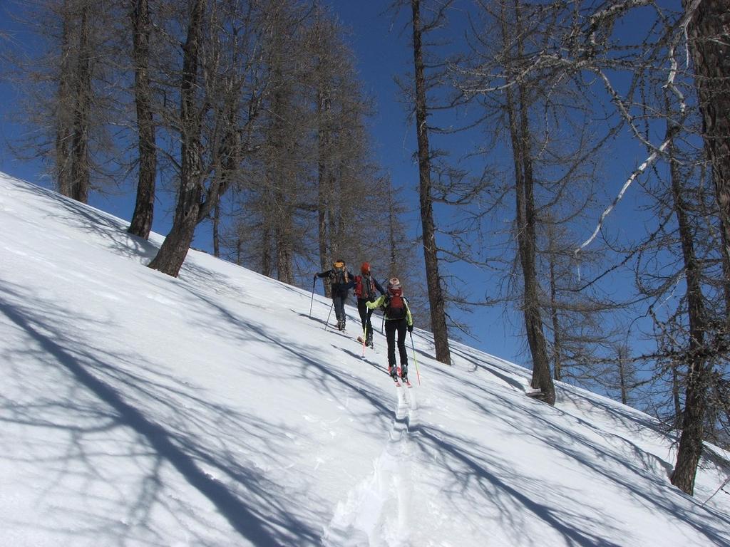 Risalire il boscoso e ripido pendio fino a quota circa 1750 nei pressi di una radura. voltare a dx, salire per valloncelli fin quando non si intravede sulla sx un canalone che scende dai pressi della pointe de viole.