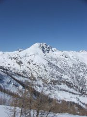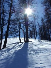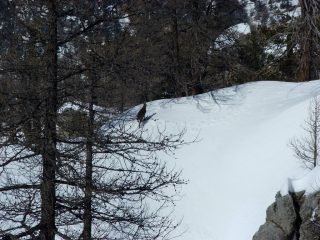 Giungiamo allegri alla regione Taupè, dove una larga voragine nel manto di un versante rivolto a sud, ci conferma che i bollettini avevano ragione sulle condizioni della copertura nevosa. Proseguiamo sul crestone che delimita la conca su terreno sempre più ripido con crosta portante e dura e che costringe a qualche attenzione in più. Proseguiamo in direzione sud tra i larici fino a Pointe de Viole, dove la neve dura e ventata del crinale ci costringe a mettere i rampant. Proseguiamo sull’ampio spartiacque Miniére-Céva in direzione ovest e poi sud-ovest, giungendo in breve alla vetta est del Point de la Corne de Bouc. Dopo esserci rifocillati, iniziamo la discesa valutando la possibilità di scendere da quota 2378m direttamente in direzione nord. Tra i larici, scendiamo in un bosco incantato e molto vario dove incontriamo un camoscio solitario. Peccato per qualche tratto di crosta non portante sul rientro, ma ottima gita caratterizzata da un paesaggio davvero meraviglioso.