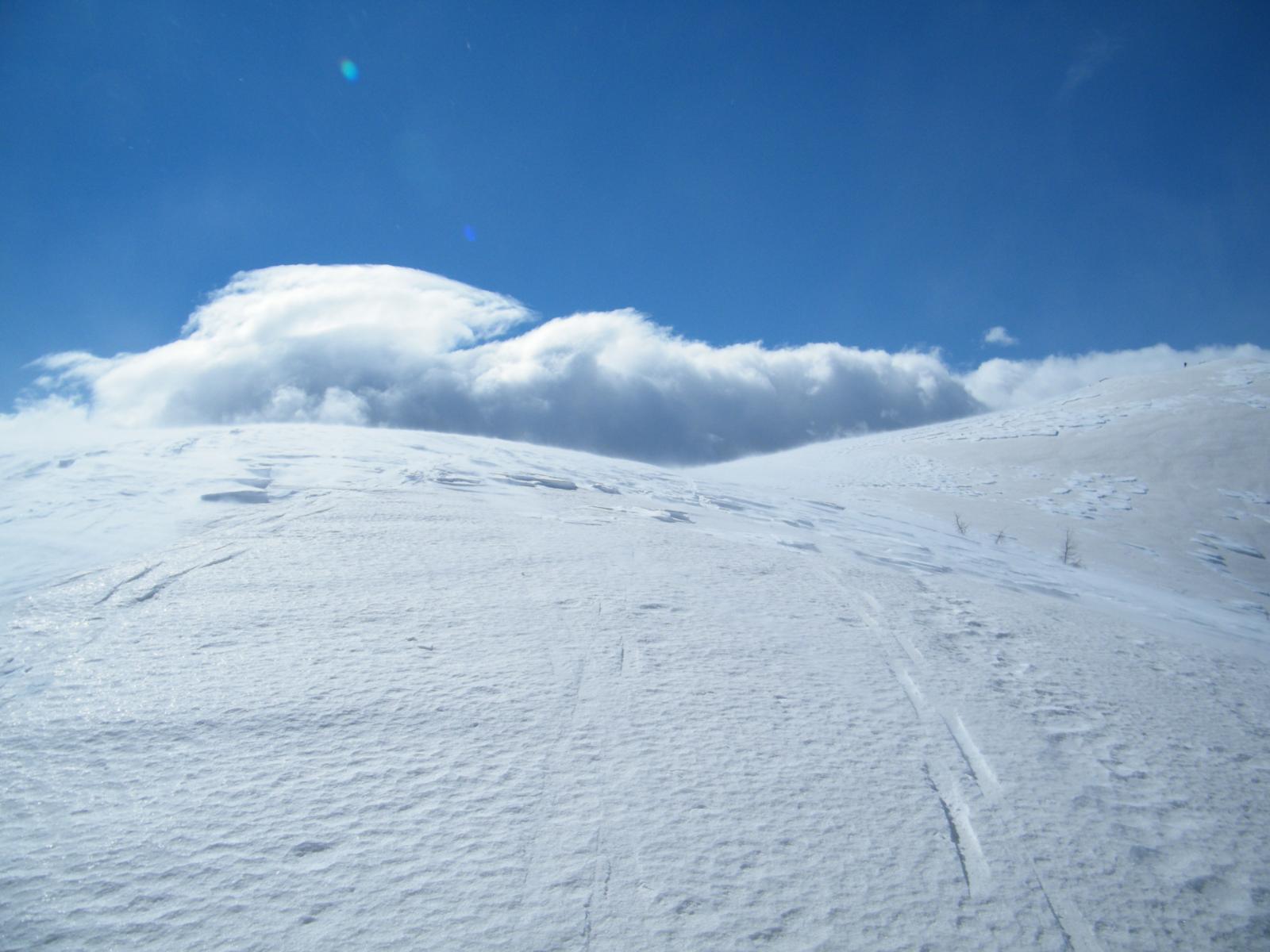gruppo di 10 persone,cielo nuvoloso variabile,nella notte ha nevicato,alla partenza ancora qualche fiocco sporadico,vento abbastanza forte in alto che ha già spazzato via la neve fresca sulle creste e ha messo a nudo la neve “rossa”