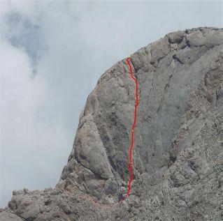 - L7 Sulla sx del terrazzo lo sperone è solcato da un diedro provvisto di 3-4 Chiodi:scalarlo e proseguire per placchette (25 m, V , 2Ch. in sosta)Il diedro è evitabile sia a dx che a sx (III+)