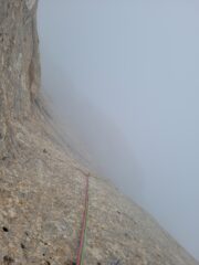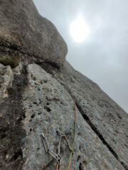 L7 – forse il più bello. Una mitragliata di chiodi a pressione che servono per chi sale con gli scarponi (occhio a non usarli tutti altrimenti finiscono i rinvii), placca tecnica con passi di 6a a mio avviso ma sempre protezioni ascellari. Finiti i chiodi sotto un evidente tetto, si segue una fessura rimanendo bassi e seguendo la pancia della parete verso sinistra si arriva a sostare. Obbligo di allungare tutte le protezioni!!!!