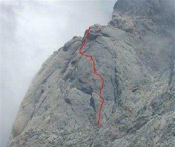 Non molto evidente, ci sono diversi itinerari in pochi metri, cercare di scorgere in alto le grandi lame che caratterizzano la prima parte della salita.
