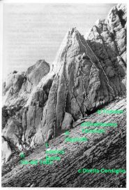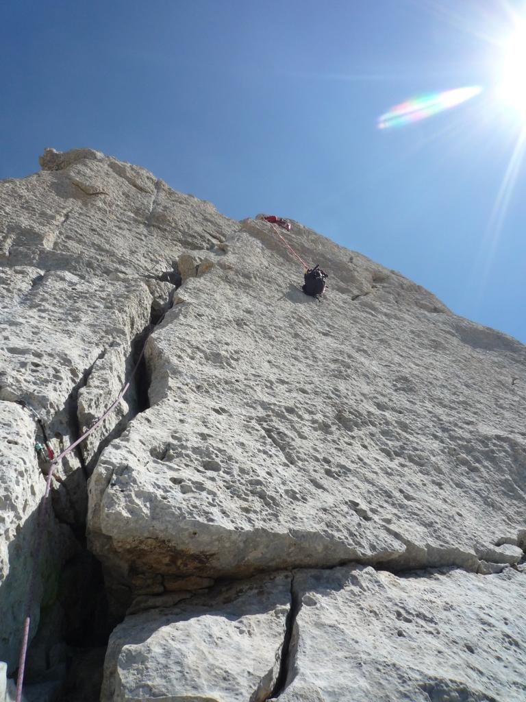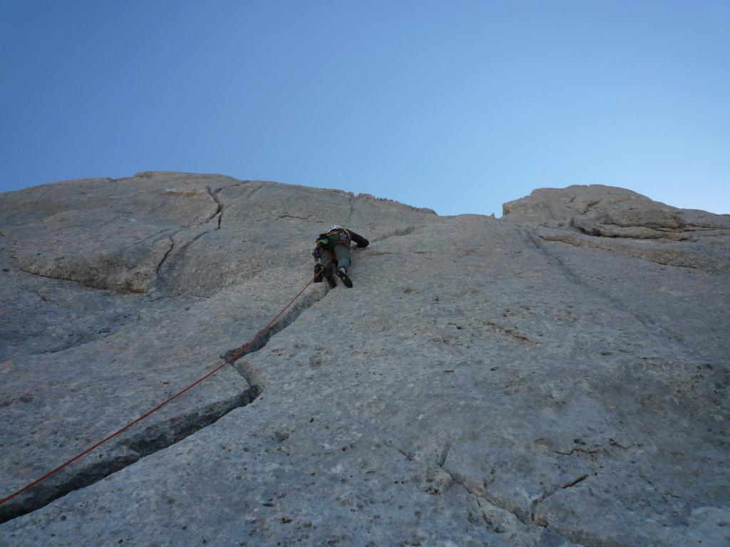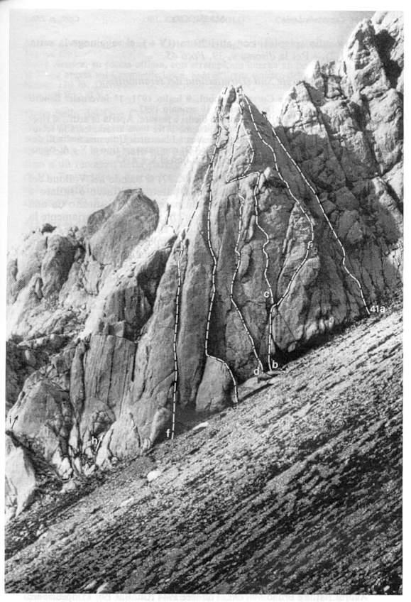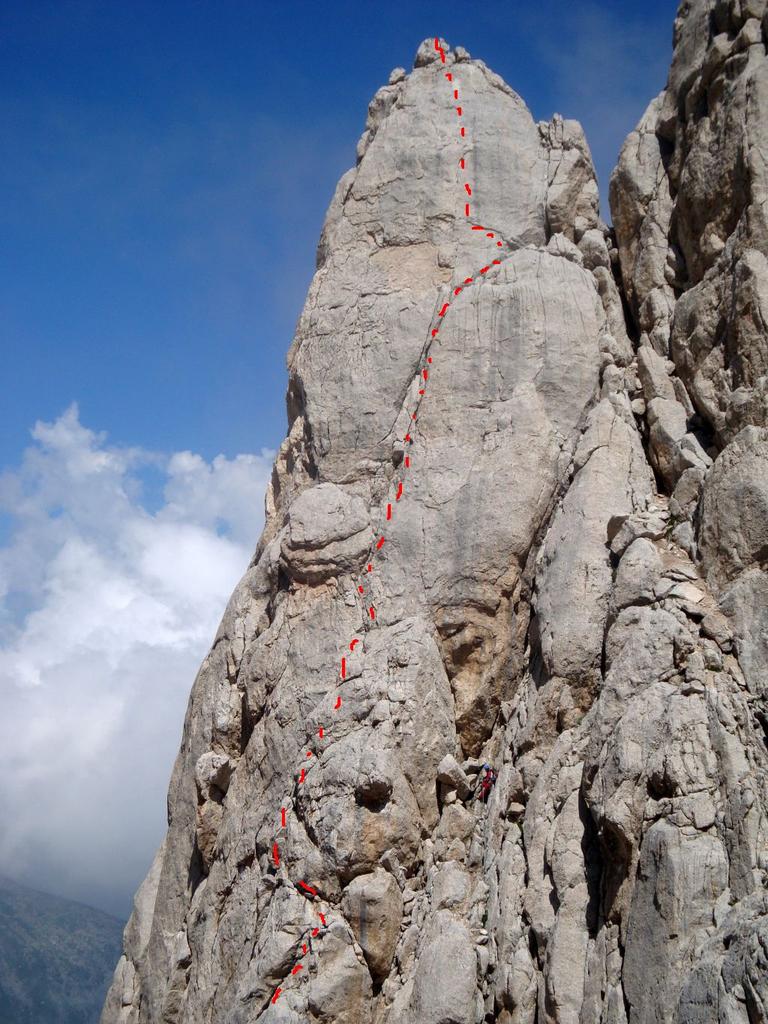Non proseguire in fessura, ma per una rampa che va verso destra; oltrepassare uno spigoletto e con un camino arrivare a una cengia sotto la bella parete terminale che si supera lungo fessure (2 tiri, IV- e IV), giungendo esattamente sulla cima (ore 1-1.30).