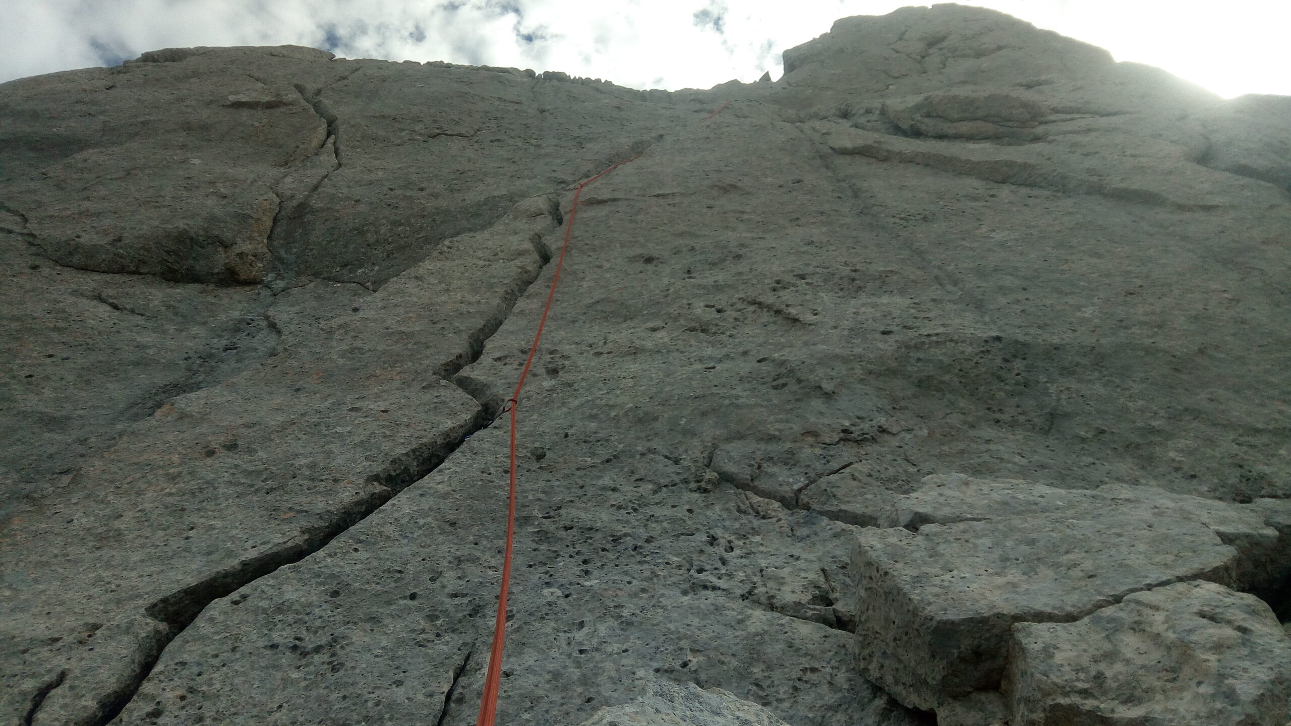 La mitica “fessura serpeggiante” è sostenuta e non banale rispetto al grado dichiarato di IV-. Ha un solo chiodo, e va integrata o con friend grandi (3 BD e oltre) oppure arrangiandosi con cordini su clessidrine o precari sassi incastrati, a un certo punto una fessurina interna prende uno 0.75 BD.