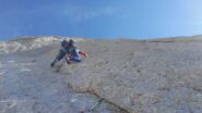 L3 Salire il diedro fin sotto al tettino, superandolo a dx per fessura, quindi obliquare leggermente a sx fino ad una scomoda sosta sotto una scaglia.