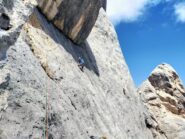 Risalire la fessura fino in cima al lastrone (V+, 20 m; è anche possibile raggiungere questa sosta percorrendo un caminetto sulla sinistra, II). Si traversa a destra sulla placca inclinata sottostante il tetto ( IV+, cavetto d’acciaio, ch), si punta al bordo del tetto (V, ch) ed entrati nel diedrino che questo forma sulla destra, si raggiunge uno scomodo punto di sosta (15 m. dal cavetto, in tutto 35 m.).
