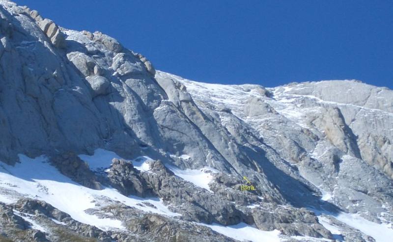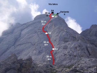 L1: 35 metri, III+, sosta (S1) con 3 chiodi.