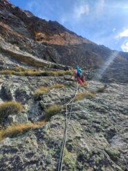 - L4: verticalmente sopra la sosta , vincere un primo bombè che adduce poi ad un muretto ben ammanigliato seguito da splendido traverso verso destra . sosta posta appena sotto la vena di quarzo (5a, 4, 6 fix, 35 m)