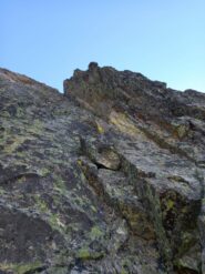 - L5: vincere un primo muretto verticale e delicato appena sotto la vena di quarzo, seguito da un vago diedrino a destra (attenzione , qui si incrocia rinviandone anche un fix , la via Roby , che prosegue a sinistra lungo il diedro di quarzo) proseguire quindi in ascesa per bei muretti , leggermente verso sinistra , sino in sosta posta su piccolo gradino. (5c, 4, 5a, 8 fix, 35 m)