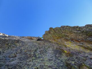 Come già scritto nei commenti precedenti, la via, pur non presentando difficoltà troppo elevate, non è banale. La distanza tra le protezioni e la difficoltà ad integrare (friends non utilizzati) ne fanno un bel banco di prova a livello mentale. Per il resto roccia ottima (qualcosina muove sulla vena di quarzo), tracciato molto bello, giornata spettacolare e solita accoglienza super al Bozano. Con Silvia, Alberto e Rossella.