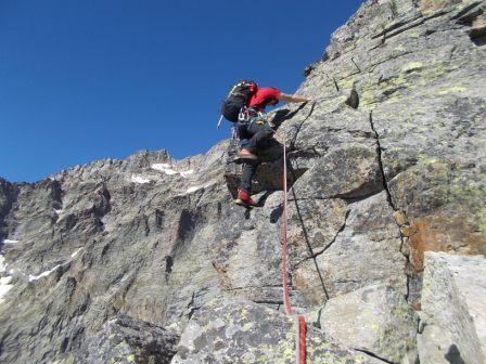 L9-Non proseguire sul filo della cresta (via Manera) ma traversare a sx su placca, puntando a una spaccatura-diedro inclinata, risalirla per ritrovarsi nuovamente sul filo della cresta (V). Sosta a fix usata per la calata.