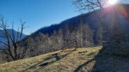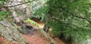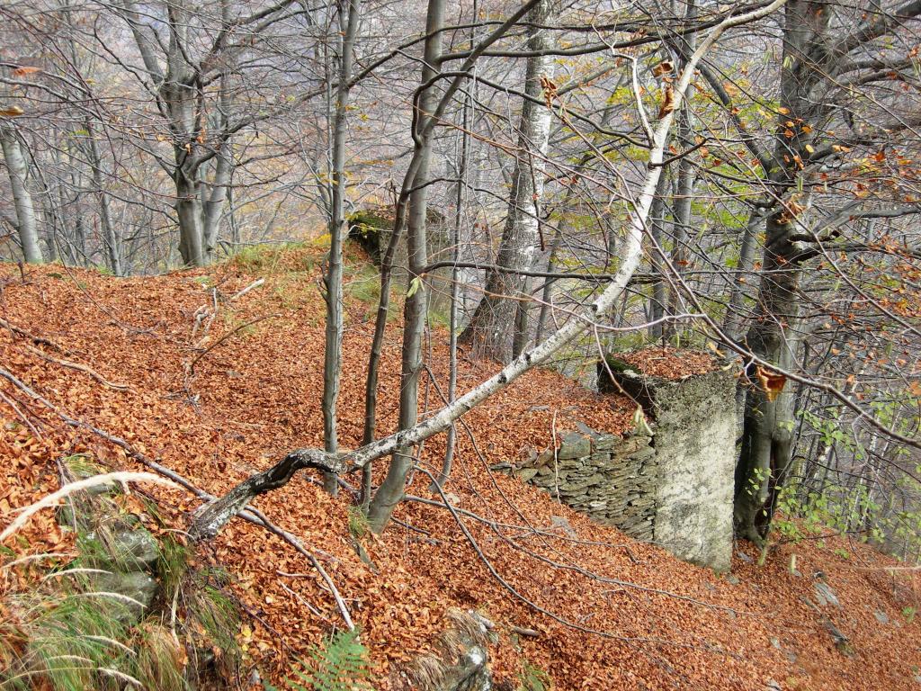Si segue una evidente mulattiera che ci riporta nei pressi della baita incontrata all’andata. Qui seguire a destra i segni rossi sugli alberi che dopo 15′ ci fanno incrociare un’altra mulattiera che risale il versante con dolci tornanti.