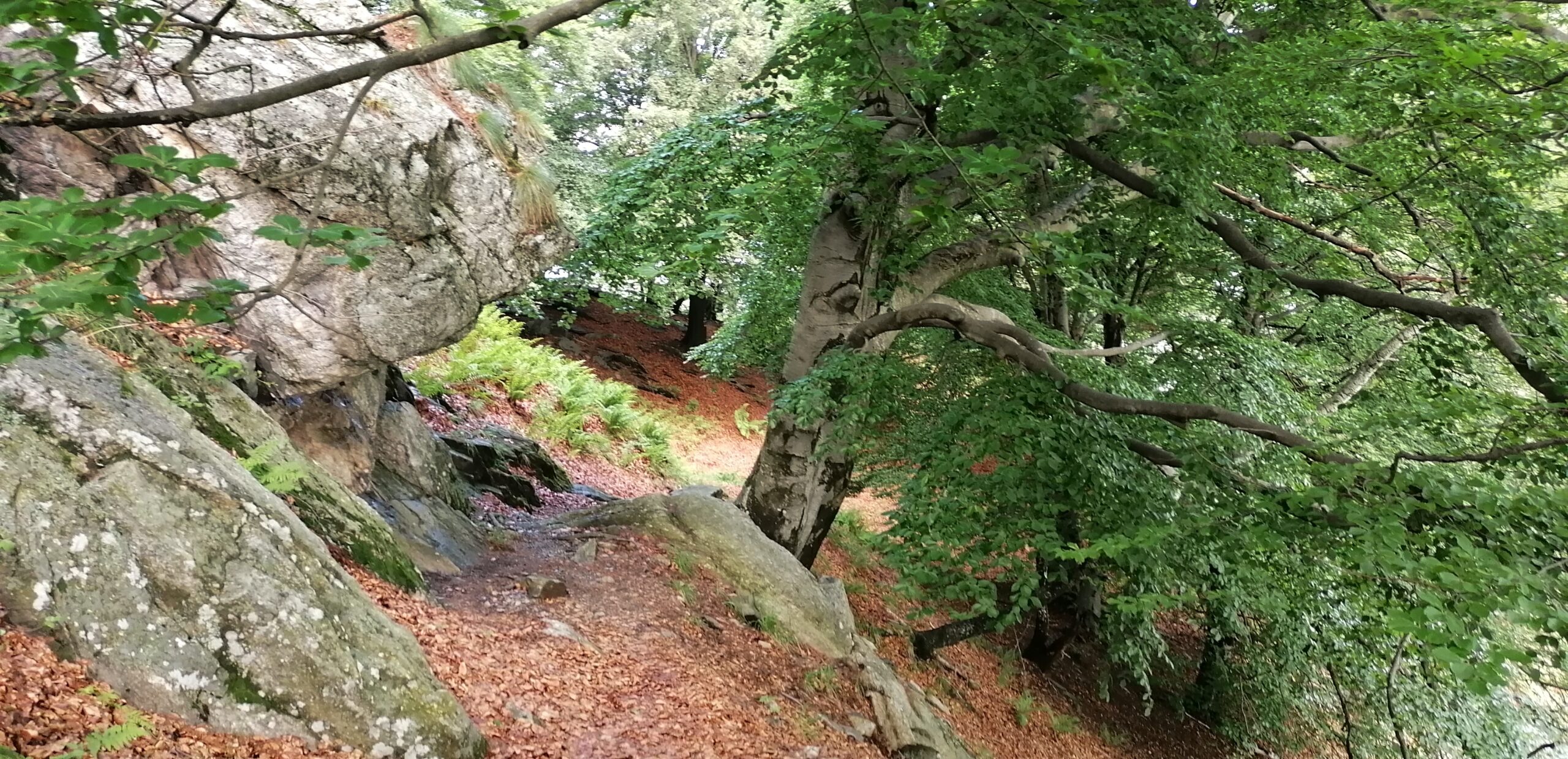 Dall’Alpe Ompio si segue per un breve tratto il sentiero per il Monte Fajè. Ad una selletta con croce, scendere sul versante valgrandino iniziando una lunga traversata nella faggeta.