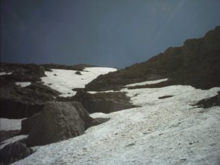 Discesa al centro del v.Crivellaro per uno stretto e ripidissimo scivolo nevoso che permette di superare al centro il salto roccioso tra il pendio superiore e quello inferiore.