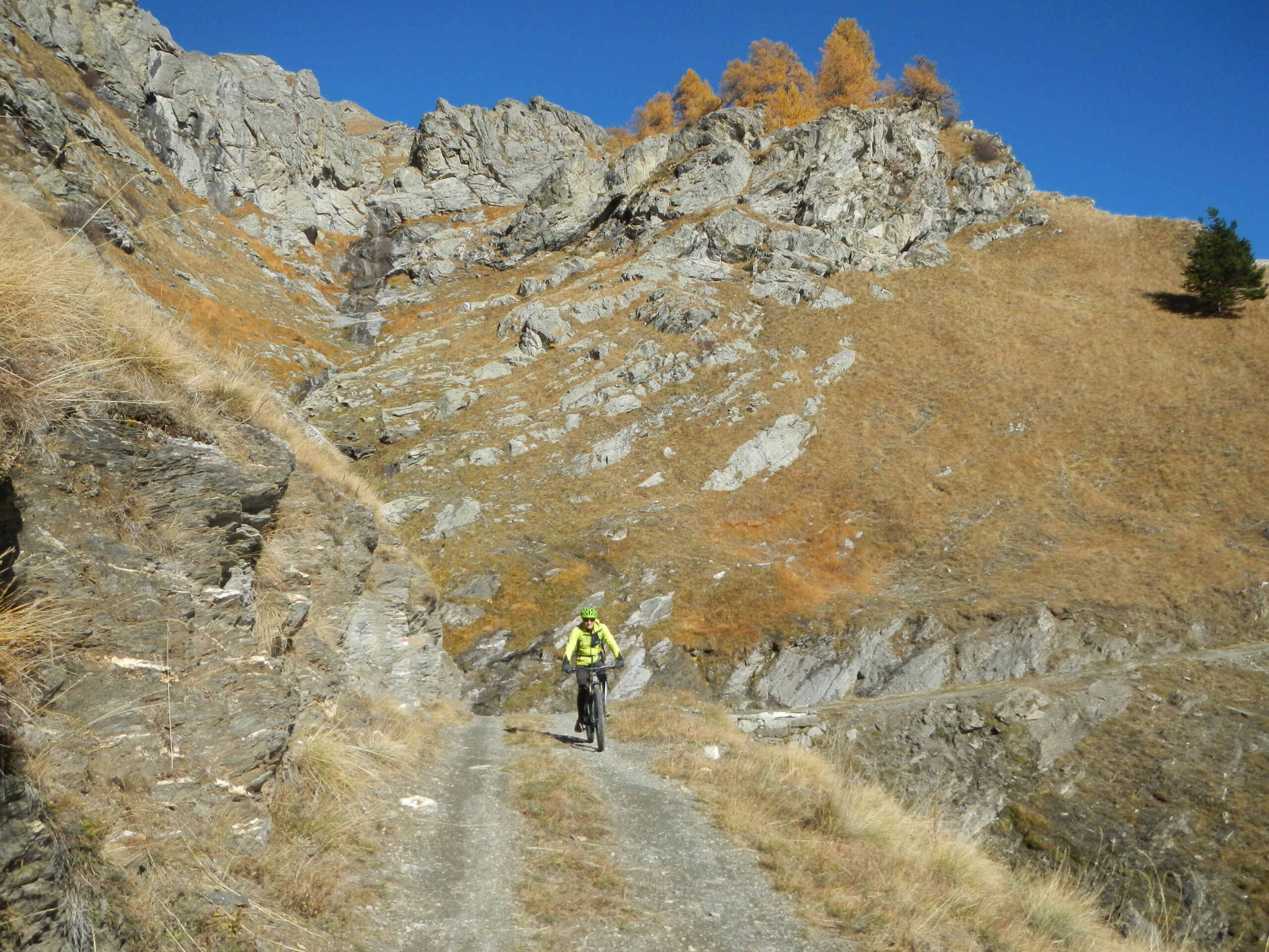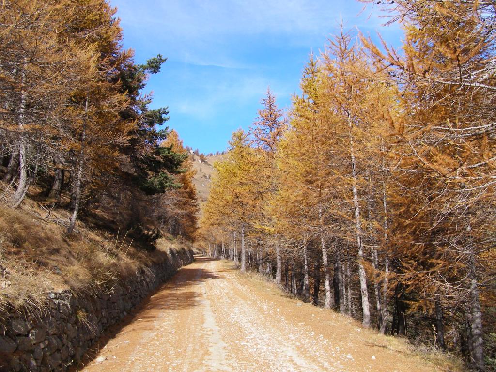 Terminato l’asfalto si prosegue sulla carrozzabile sempre in salita (molto pedalabile) che passa nel bosco di larici prima di uscirne fuori, in direzione del Rocciamelone.