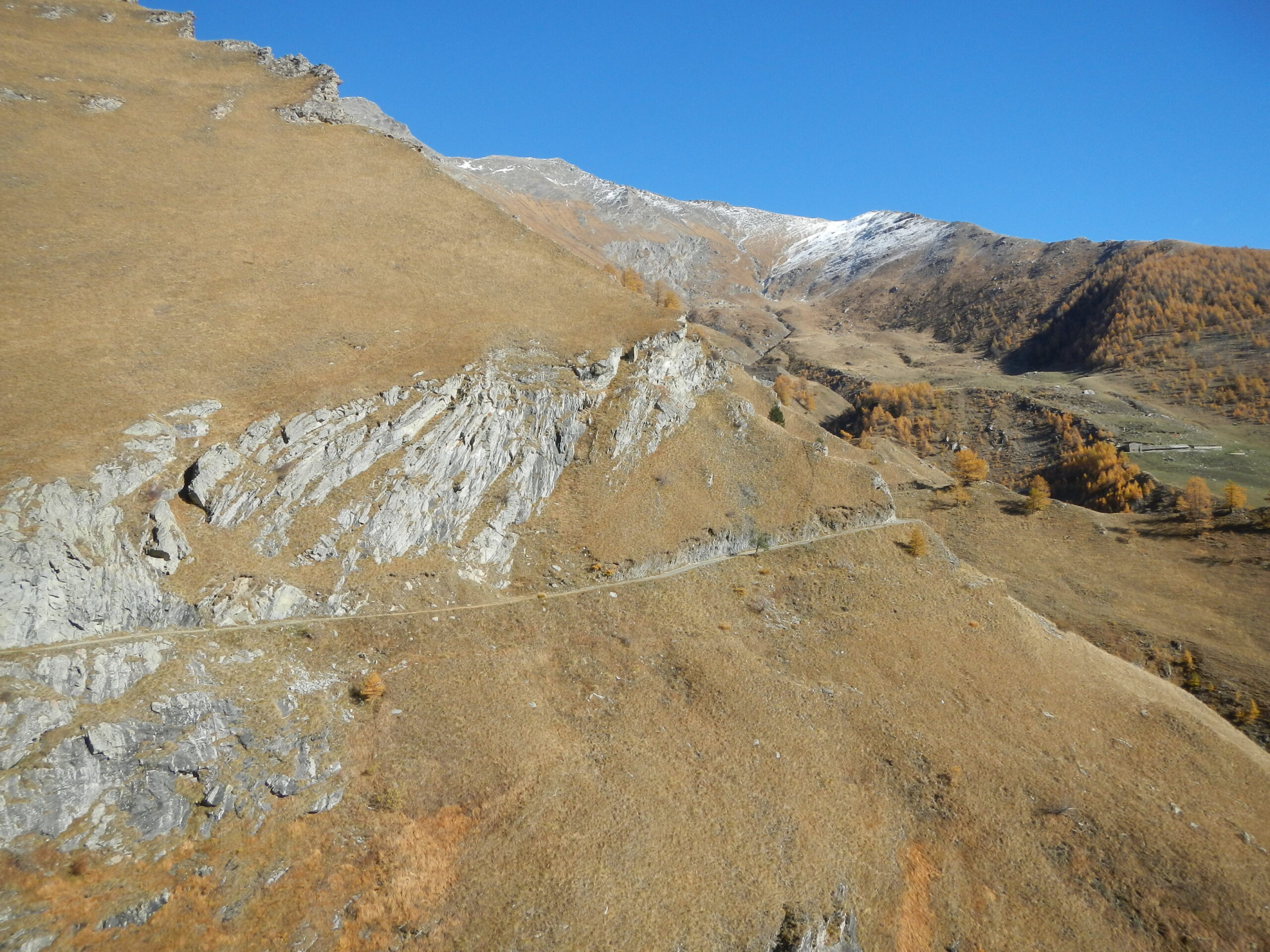 Discesa, a ritroso per alcune centinaia di metri, finchè sulla sinistra (senso di marcia) si intravede una specie di strada-sentiero inerbita, che con percorso molto dolce e panoramico porta al Truc o Trucco. Da qui si può decidere se risalire alla strada percorsa all’andata (discesa MC), oppure se scendere a Susa sul sentiero 558.