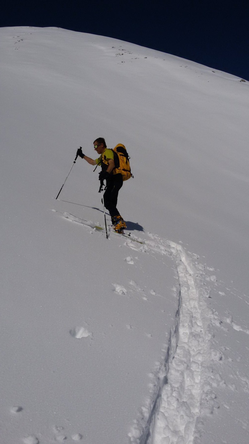 Sci dall’auto su traccia esistente poi, giunti a 2300 m e senza sapere di questo itinerario (idea iniziale Col Serena come una ragazza partita con noi), tracciamo verso dx per imboccare l’evidente valletta abbastanza ripida e lineare che ci ha portati in cresta a pochi passi dalla cima formata da un’onda di neve. Qui giunti vediamo il vallone dietro di discesa tutto intonso su pendenze sostenute. Discesa da urlo fino a ricongiungersi molto in basso alla traccia di salita.