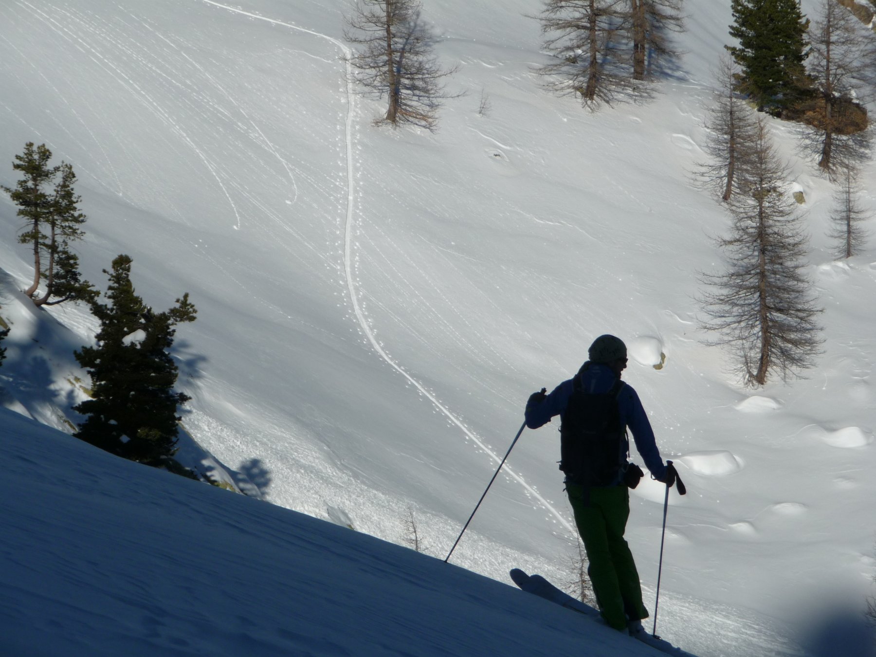 Partiti verso le 8, freschetto alla partenza -4° circa. Saliti su buona traccia ‘locale’ fino al Piano della Regina da qui tutta da tracciare. Neve più asciutta di ieri ma in alto il vento ha lavorato creando una fastidiosa crosticina. Solito ripellino sotto la vetta e discesa così così nella parte alta, spettacolare nella parte centrale poi conviene seguire la stradina per ampi tratti nel bosco e qualche pietra qua e la si tocca… Da pian della Regina strada tritata dai passaggi di chi ha puntato il Vaccia.
