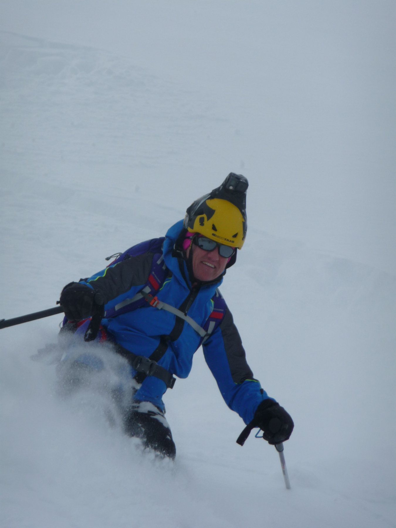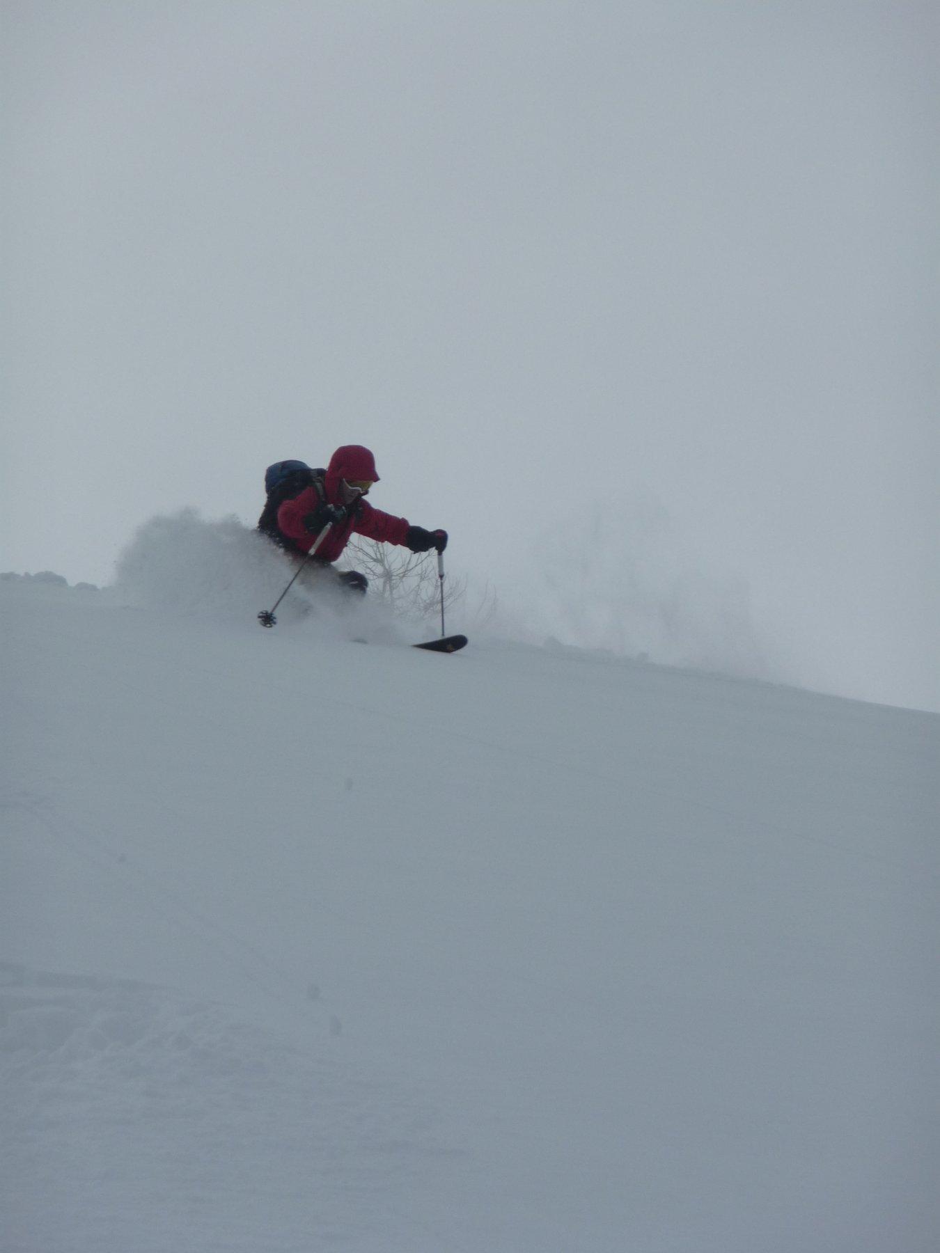 Partiti da Pietraporzio con ancora cielo nuvoloso e da li a poco inizia a nevicare e ci accompagna fino in vetta. Stradina per il Piano della Regina battuta dal gatto, dal piano alla vetta tutta da tracciare. Neve polverosa tra i 20-30cm che posa su uno strato più compatto. Discesa spettacolare, polvere intonsa dalla croce di vetta fino al piano della Regina con il cielo che ci concede una schiarita.