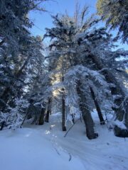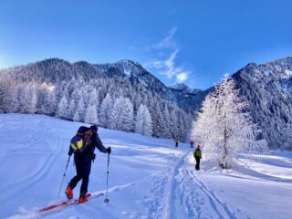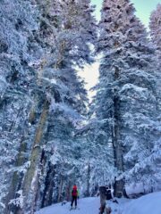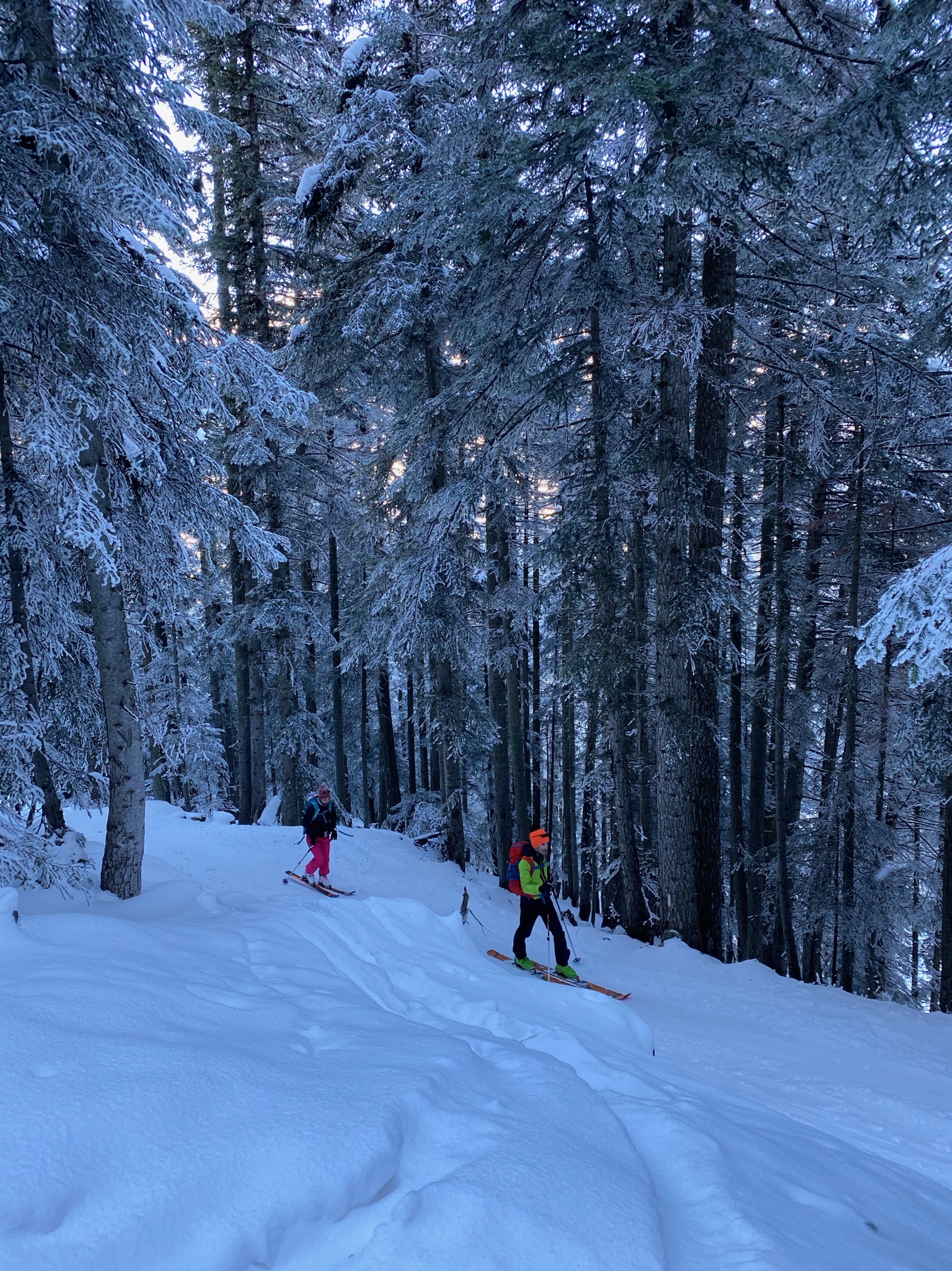 Finalmente neve fresca e temperature rigide! A parte un po’ di crosta da vento sulla cresta, farina di primissima qualità in abbondanza su tutto il percorso. Peccato solo che la gorgia in basso non fosse intasata a sufficienza, costringendoci a seguire la stradina nel bosco, ma sono quisquilie. Gita di grande soddisfazione e tanto, tantissimo divertimento in discesa!