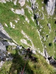 Le relazioni che avevamo parlavano di “piccoli passi di arrampicata”, niente di più lontano dalla realtà. Si arrampica per davvero e dal II si va al III grado molto rapidamente, e ancora una volta su erboni molto scivolosi e roccia dubbia. Noi abbiamo fatto un tiro di 60m per tutta parte finale del Canalone sostando su uno spuntone abbastanza dubbio appena sotto i prati verticali tra Costanza e Mongolfiera. Appena sotto abbiamo trovato anche uno spit di calata e risalito dei camini che, garantito, per noi erano di III grado almeno.