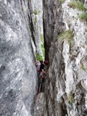 3°tiro: si comincia un lungo traverso ascendente verso destra, su roccia direi abbastanza delicata e non proprio buona integrando quando possibile su fessure decenti. Si raggiunge un fittone appena dopo un tratto di traverso delicato per via della roccia. Da lì ancora in obliquo a destra e poi sinistra su facili erboni gradinati fino a prendere il camino creato dalla lamona enorme e staccata dalla parete. Il camino è facile fino a circa metà, dove si riesce a mettere un ultimo friend in una fessurina molto in basso a destra vicino a un masso incastrato sul fondo (che tra un po’ viene giù…), dopo risulta improteggibile e liscio e da risalire schiena al muro abbastanza faticosamente e fisicamente. L’abbiamo trovato leggermente umido nonostante la giornata fosse molto calda e dopo un periodo secco senza piogge. Qualche provvidenziale tacchetta a sinistra aiuta a venirne fuori. Direi IV+ all’inizio, poi III e ancora III+/IV+ il camino.
