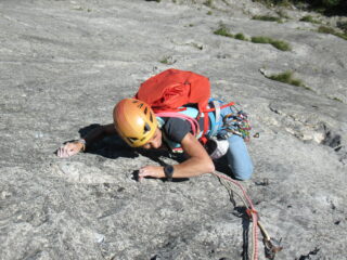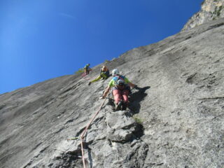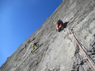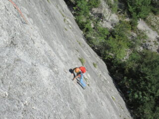 Via di placca decisamente chiodata lunga e in alcuni tratti pericolosa, è vietato volare. Inutile portare protezioni mobili, consigliati cordini per allungare gli ancoraggi. In realtà la via non è stata richiodata, se non con l’aggiunta di alcuni fix oltre a quelli artigianali rimasti, sono presenti dei chiodi tradizionali lungo i tiri. Soste per la calata in corda doppia con catene.