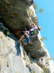 L6. Superamento di un marcato tetto, primo moschettonaggio “effetto soffitto”, poi forza e decisione su nette maniglie con chiodatura che permette di azzerare, 7a/Ao;