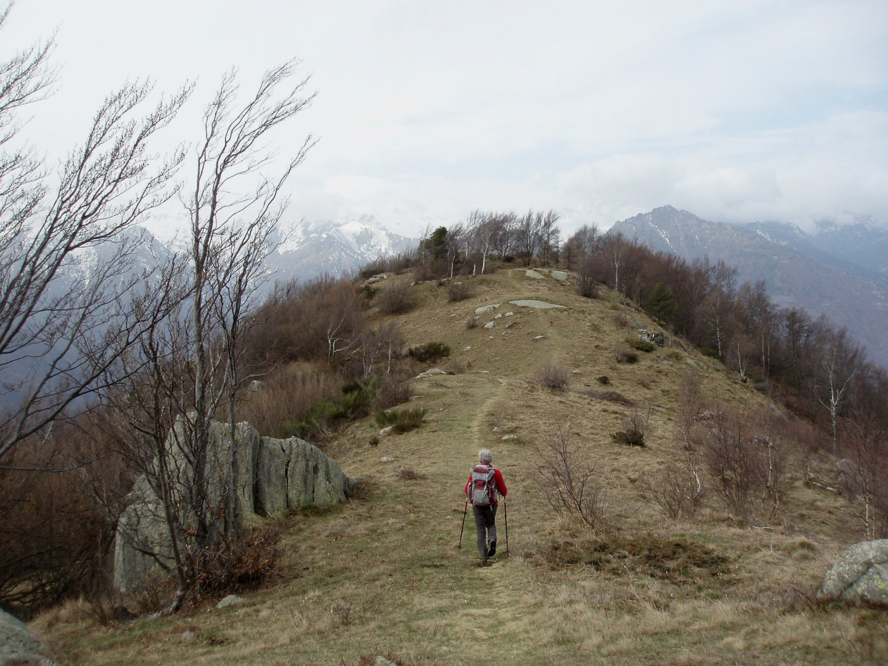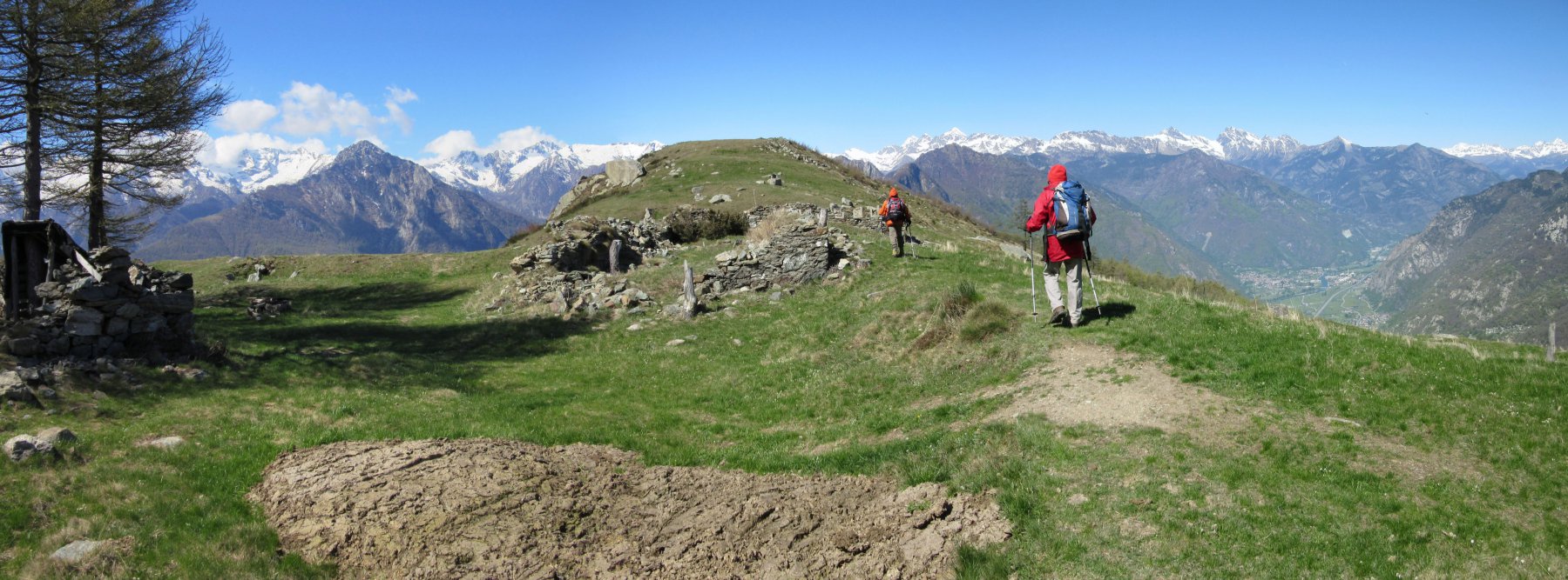 La si percorre su decise pendenze superando varie baite, ignorando quindi sia il sentiero non numerato che risale sulla sinistra in forte pendenza sia il ramo dello stesso sentiero in discesa sulla dx. Superato con un traverso d’alta ingegneria il bastione roccioso della parete (punto panoramico eccezionale) la mulattiera volge bruscamente a destra (nord-est) e raggiunge infine l’alpeggio di Verale (cappella con campanile caratteristico, fontane, forno ). Circa all’altezza della cappella si svolta a sinistra per riprendere la mulattiera che diviene nuovamente evidente dopo pochi passi. Superato un alpeggio isolato (fontana) e lasciati a sx i possenti ruderi di una fortificazione, si giunge in breve agli alpeggi del Col de Cou 1372 m. Da qui si svolta a sinistra per raggiungere gli evidenti ruderi di baraccamenti militari (Ricovero Capitano Muttoni), che si attraversano. Proseguendo per pochi minuti sulle tracce di sentiero che percorrono il vasto dosso sommitale prativo, si giunge infine in vetta .