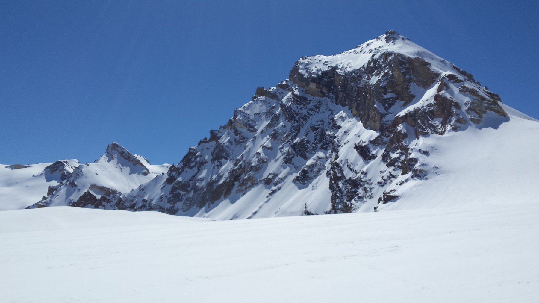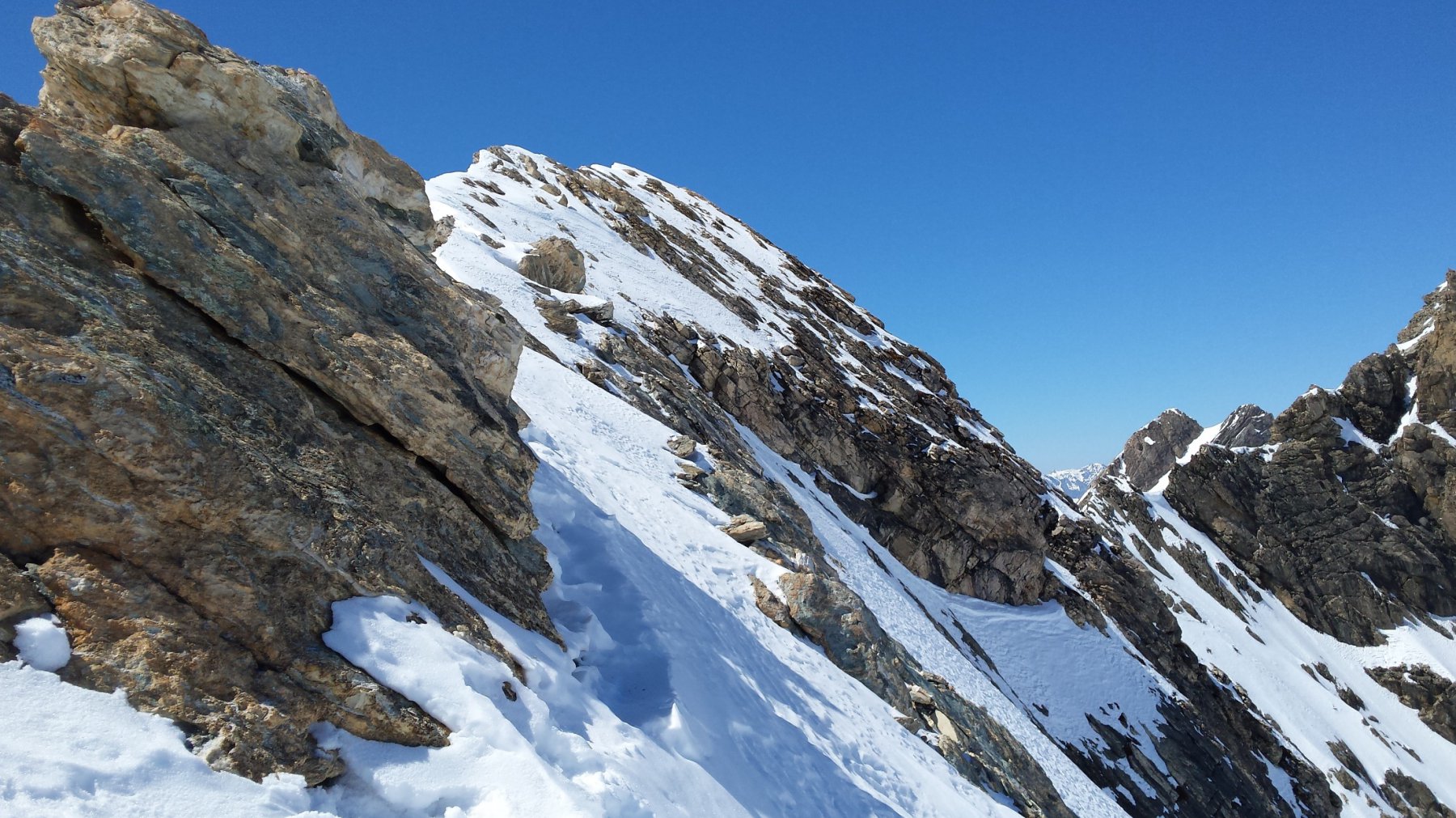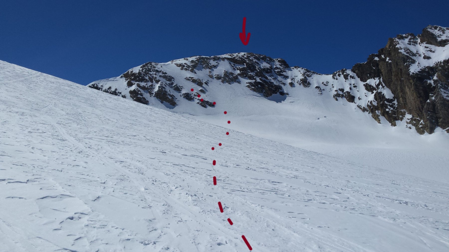 Dal colle si segue la cresta fino ad arrivare all’imbocco del bel pendio che scende sul ghiacciaio (ATTENZIONE ALLA TERMINALE E AI CREPACCI). Per la punta vera e propria, bisogna continuare sulla cresta che costringe a passare sulle placche rocciose del versante nord, ricoperte facilmente da neve.