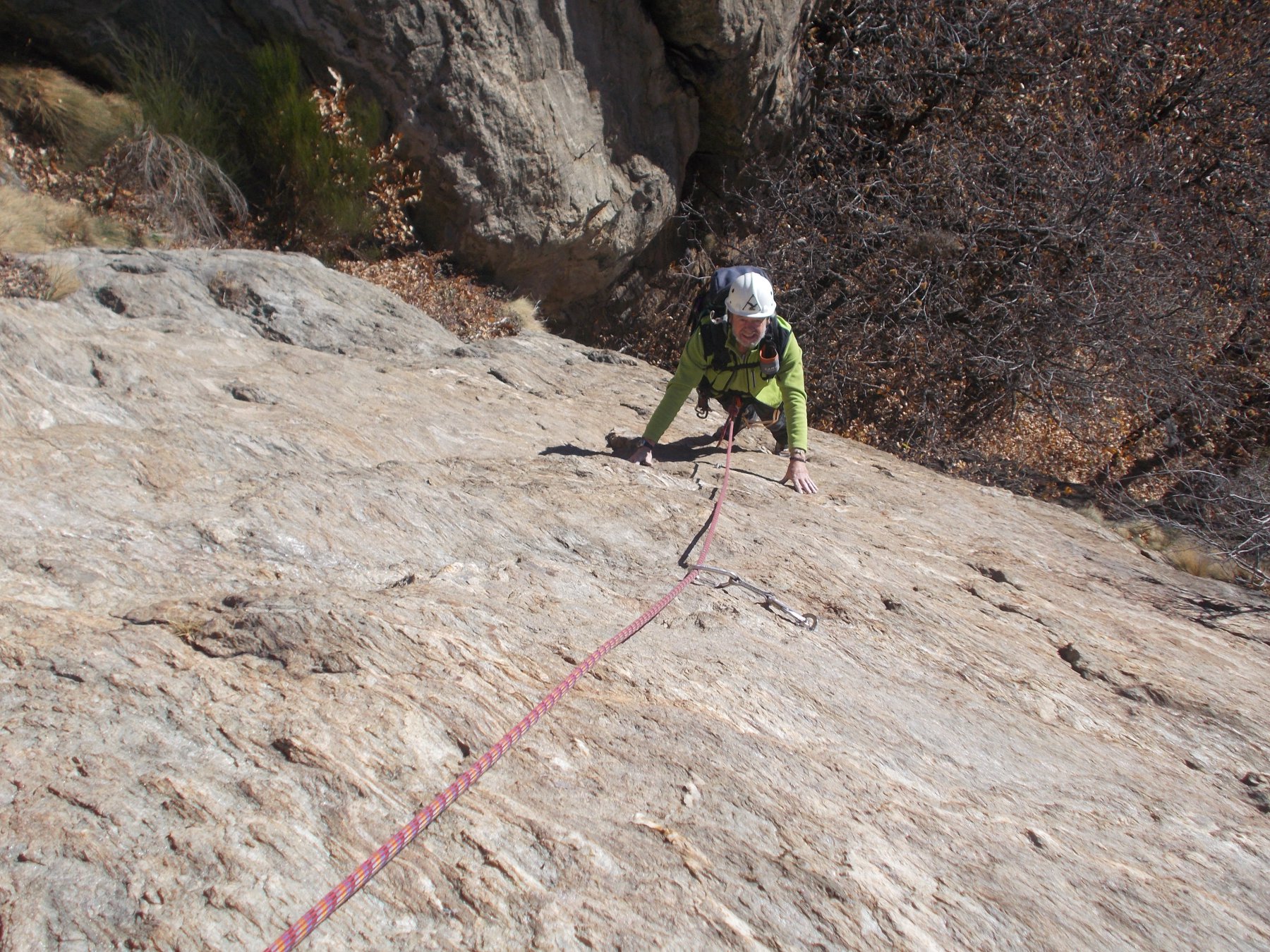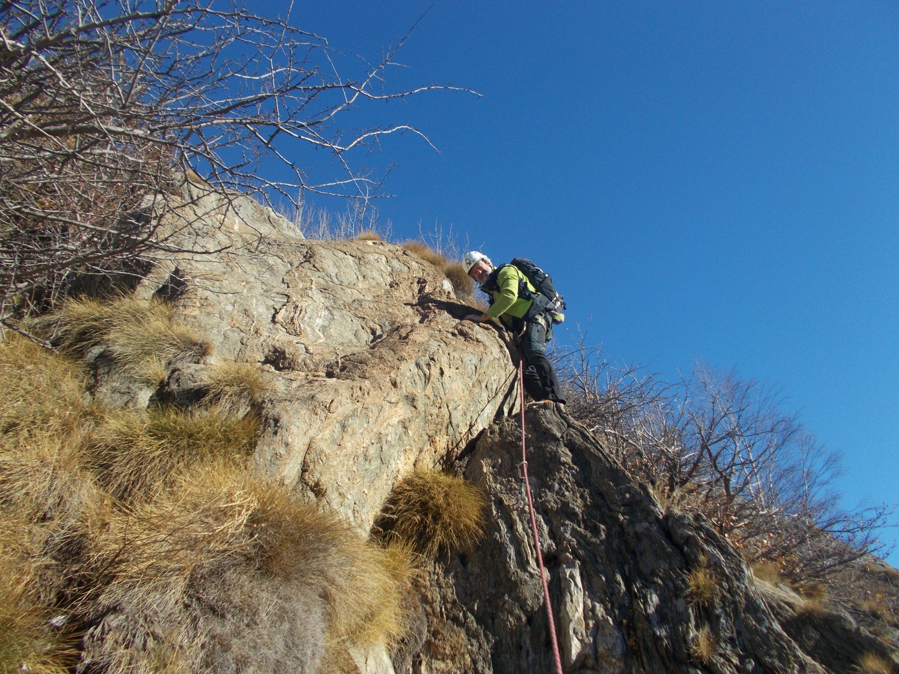 Via carina divertente prevalentemente di piedi, essendo la placca appoggiata il giusto, sono questi ultimi chiamati ad assolvere piu’ che le mani, il compito di salire badando a rinviarsi tutte le volte che si incappa in un chiodo (ormai unificati con forma e nome di spit, in inglese sta per sputare..a parte questo bene e’ comunque che ci siano). Chiodi ormai presenti in quantita’ industriali anche dove non servono, ma ci sono. Del resto qui si viene per divertirsi fare dello sport e sopratutto cercare di non farsi male, e occasionalmente fare incontri a sorprersa..non a caso ci imbattiamo in giuliof e socio, rivisto a distanza di tempo, e dove.. se non in queste falesie dove e’ facile venire a passare una giornata, ma anche solo mezza..data l’impossibilita’ in questa stagione di poter mettere a segno qualcosa di piu’ appetibile in alta montagna, che per mesi a venire piaccia o no, rimarra’ vestita di bianco.