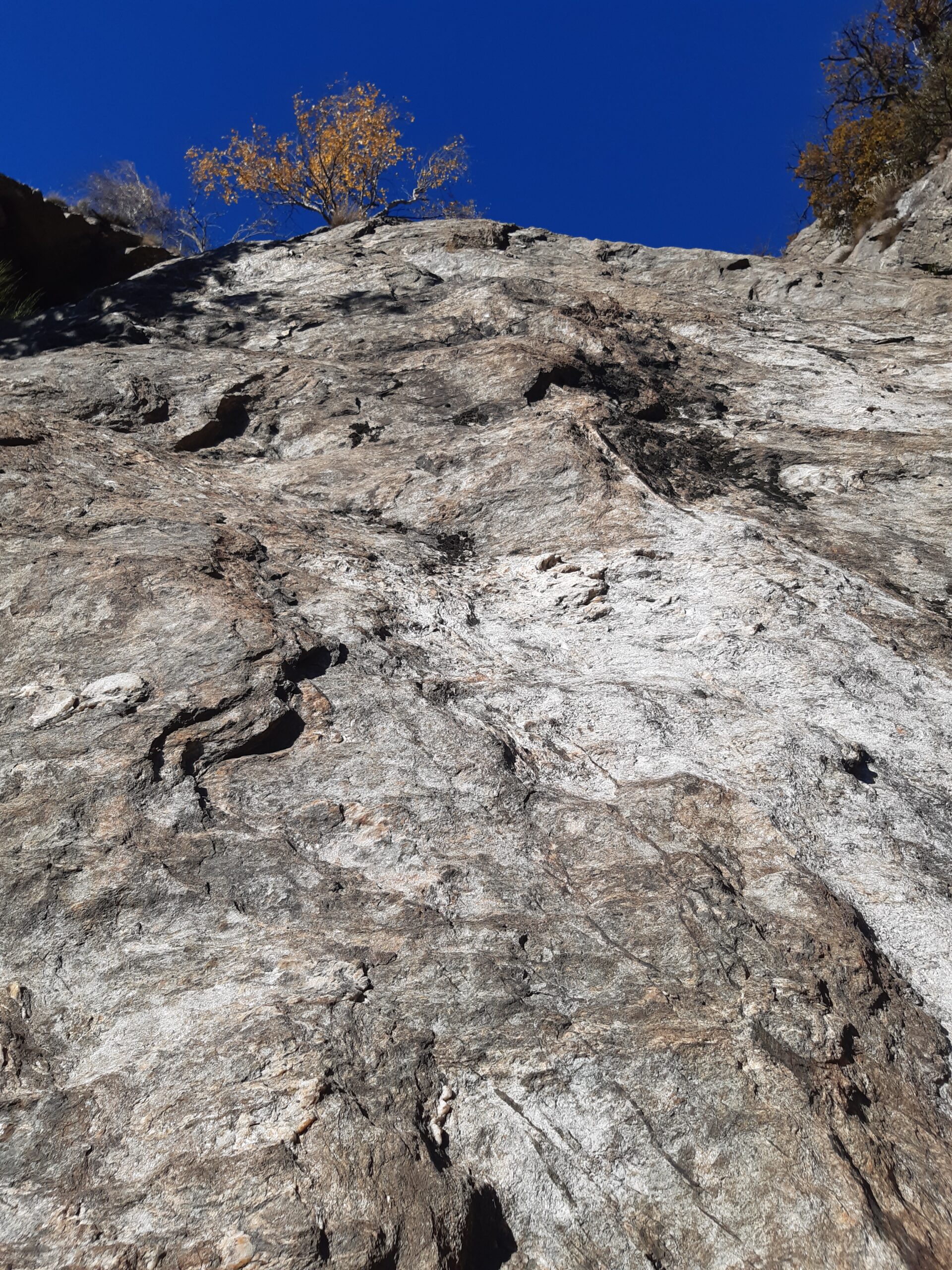 Primo tiro (4a-b) un po’ erboso, ma la roccia pulita si trova sempre, secondo tiro (5a) placca rugosa con qualche svaso e tacchetta, molto bella e confidente, chiodata abbastanza lunga, che non è un difetto ma richiede un piede sicuro. Non sapendo come si sarebbe comportato il mio (piede), ho messo una scarpa seria nel sinistro sano, e la ciabatta nel destro sofferente, e con qualche scambio di piedi (o più di qualcuno) mi sono trovato benissimo. Terzo tiro traverso facile ma ancora divertente. Come già successo in passato mancava però il maillon di calata (che non avevo) e quindi abbiamo usato una piccola ma gagliarda betulla (la linea di discesa è anche più diritta) e con una sola doppia di 60 m si ritorna alla base.