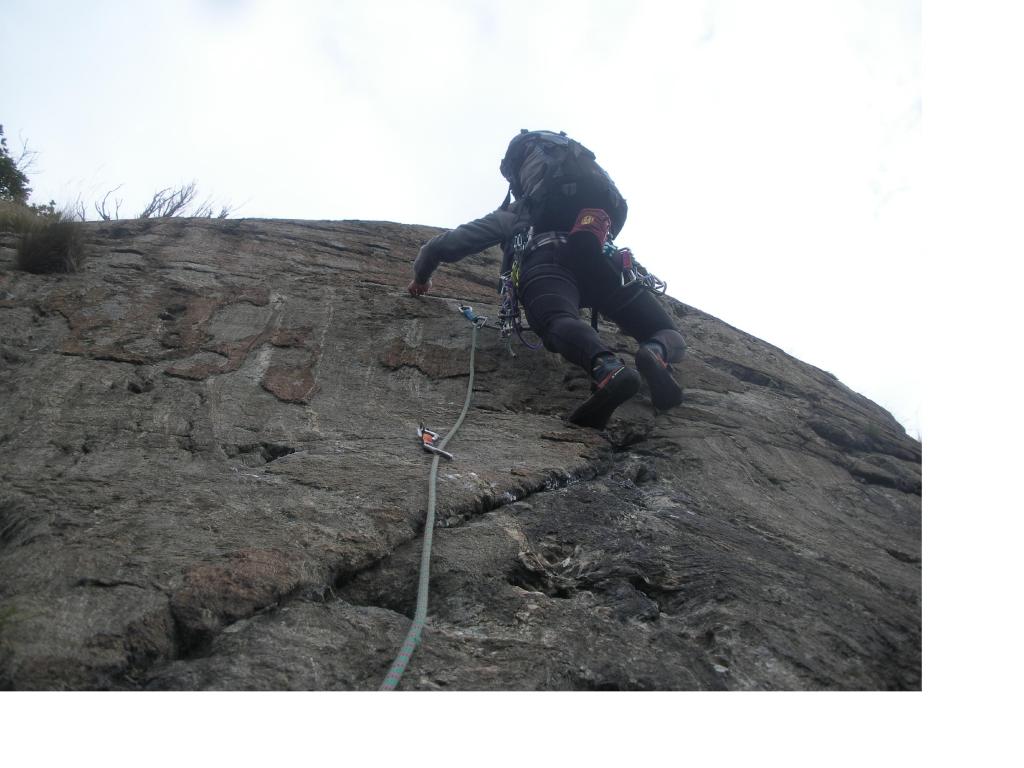 Le recenti nevicate a quote relativamente basse, ci hanno fatto optare per un giro in palestra che da tempo non frequentavamo. In quanto poco congeniale a noi alpinisti vecchio stampo, piu’ propensi per cimenti in quota da alternare di tanto in tanto anche a qualche bella escursione a piedi, possibilmente sempre in montagna. Tornati quindi seppur temporaneamente a respirare aria di palestra, dove il salire per quanto difficile seppur per brevi tratti, viene notevolmente facilitato dalla presenza di spit in sovrabbondanza. Roccia ottima, arrampicata per gran parte in aderenza su vaste e compatte placconate di solido gneiss. Soste ben attrezzate a fix 10mm. Con Franco G.