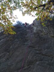 Grande Elena, ha tirato la prima parte della via attrezzando soste e recuperato più di un centinaio di metri di corde con la Guida alle calcagna, bravo Lorenzo che si è sciroppato lo strapiombo di 5c e ha recuperato un altro centinaio di metri di corde con la Guida alle calcagna, io ho solo chiuso i giochi degli ultimi 4 tiri insieme a loro…divertito molto, bravissimi 😀