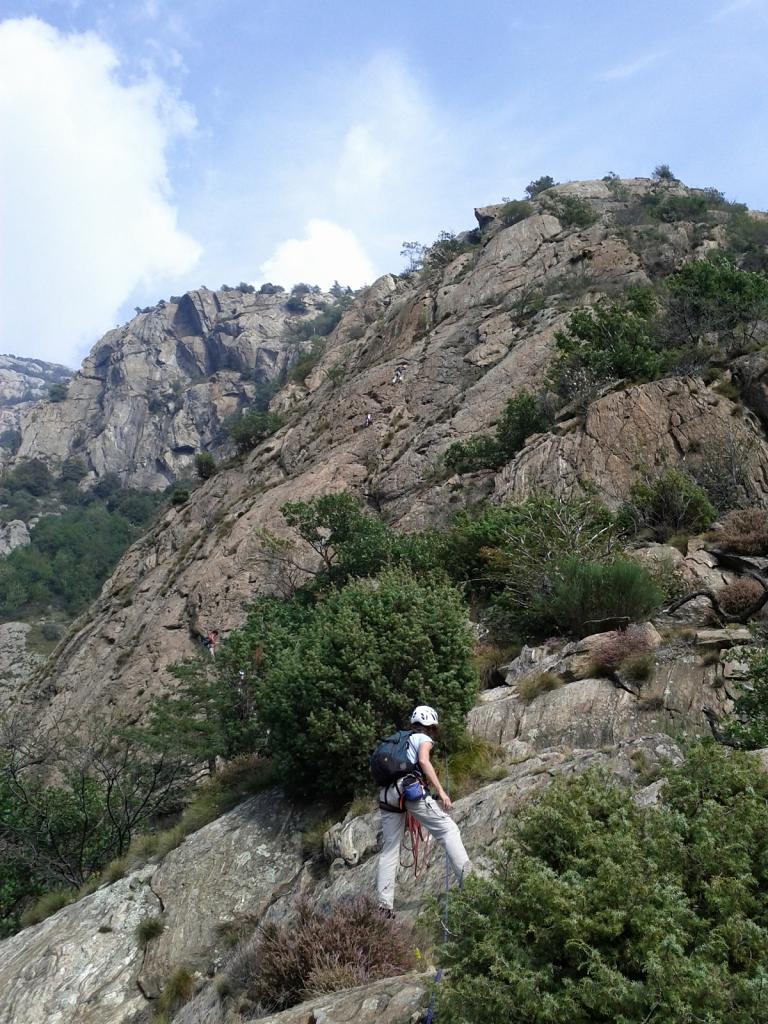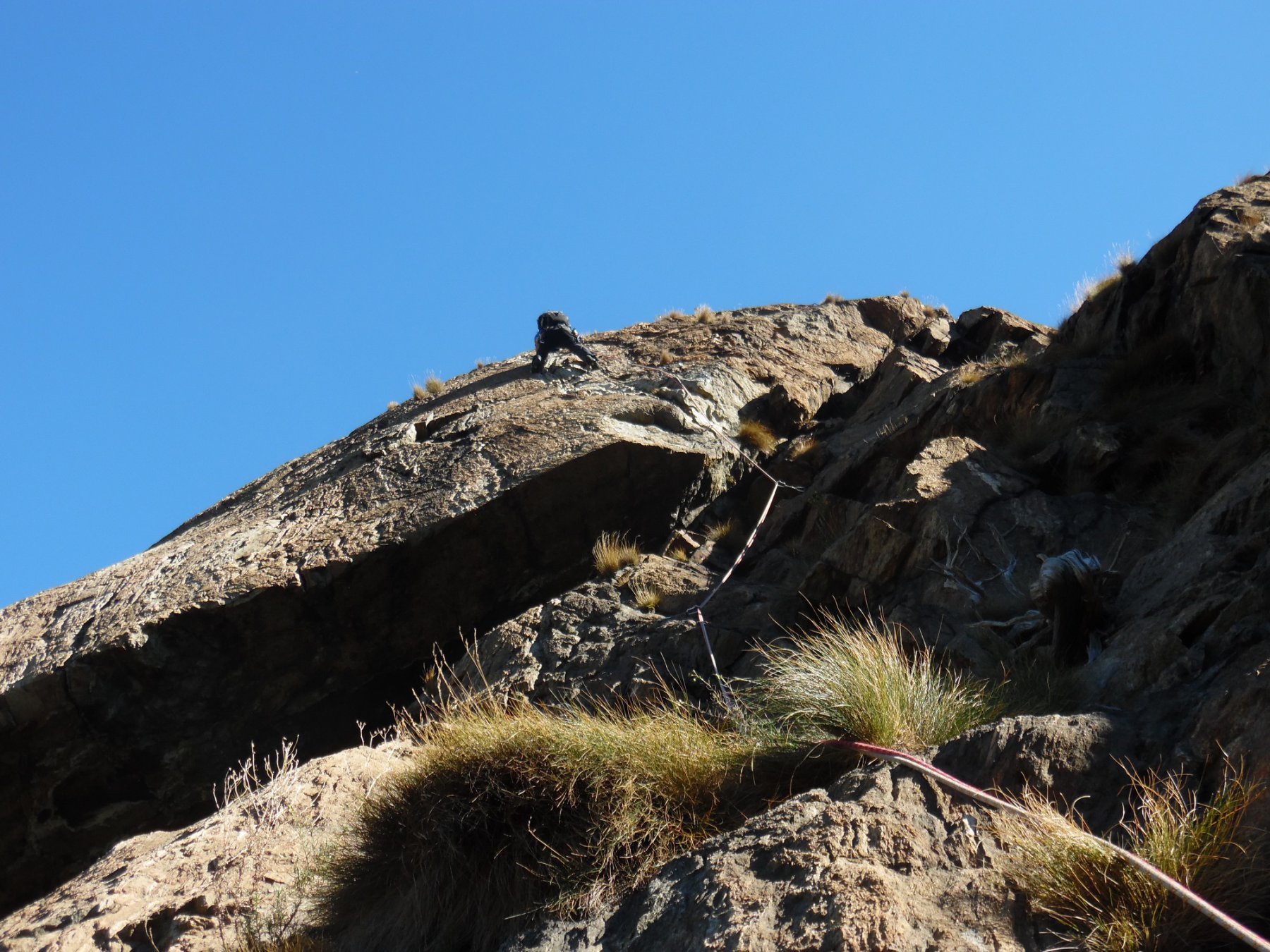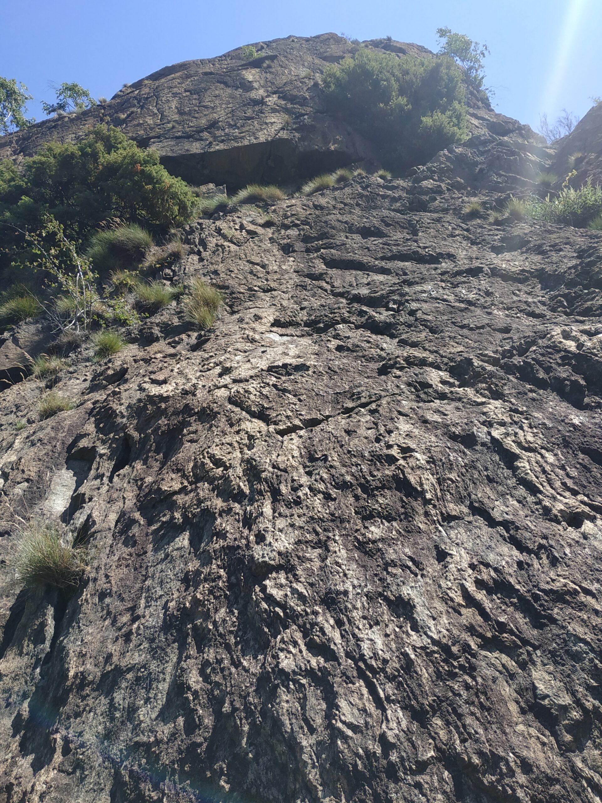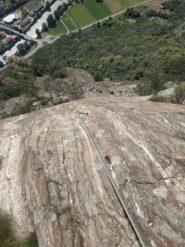 - 5 – (6a): salire fino ad un terrazzo, poi bel muro sempre più verticale ma con tacche nette, quindi fessura con masso in traverso.