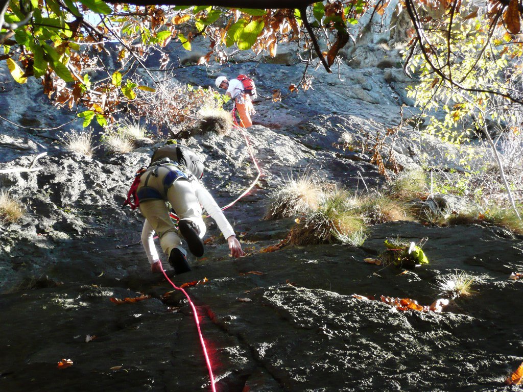 Via asciutta e temperature estive. Comodo sentiero in discesa per l’avvicinamento. Sulle prime lunghezze si sono staccate un paio di prese grandi all’incirca quanto una noce. Cordata da 3 con Fabrizio N. ai primi 3 tiri, Elisa ai 2 centrali e a me gli ultimi 3. Usciti sul sentiero alto (5 min. nel bosco) e proseguito sulla più semplice Raggio di Sole che ben si inserisce in un comodo concatenamento. Un saluto alla Guida Gianni Lanza ed al folto gruppo di biellesi al suo seguito incontrati lungo la via e sull’adiacente Table de Roc. Divertente la via e anche la scelta del nome ed il disegno all’attacco.